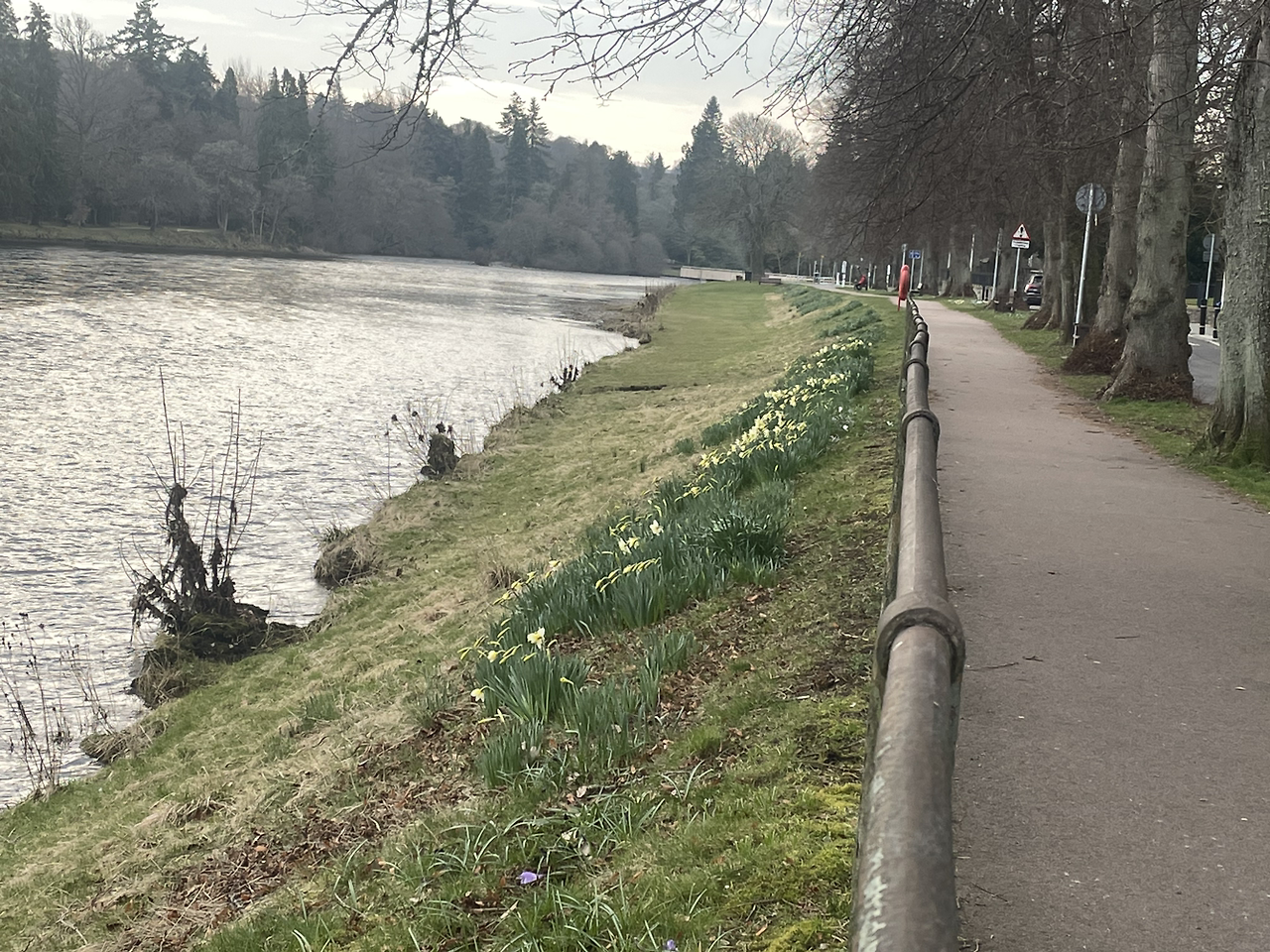 영국에선 봄의 전령으로 제일 먼저 피는 꽃이 수선화인가 보다 라는 생각이 들었다. 초록색 잎들 속에 다소곳이 고개를 반쯤 들고 있는 노란색의 수선화가 그렇게 인상적일 줄을 예전엔 몰랐던 것인데 영국 남쪽의 런던에서부터 거슬러 올라 하일랜드를 대표하는 이곳 북쪽의 인버네스에서도 유독 강가에 초록 풀숲 사이로 환하게 웃고 있는 수선화를 보자 아, 영국 3월을 대표하는 꽃은 수선화로구나 하고 느끼지 않을 수 없었다. 전설적인 괴물 네시로 유명한, 도시 남쪽의 네스호에서부터 흘러온 네스 강은 이곳 인버네스에서는 그렇게 강폭이 넓지 않아 어림짐작으로 100미터가 채 될까말까 인것처럼 보인다. 강 이쪽 편에서 저쪽 편의 건물들이 비교적 선명하게 보일 정도이다. 그 강 양편 기슭에 여기저기 노란 수선화들이 흐드러지게, 절정의 시기를 맞은 듯이 피어있는 모습에 불현듯 내 마음이 흔들리는 것 같았다. 이렇게 아름다운 풍경이라니!! 강의 유속도 빠르지 않고 적당한 폭의 강물이 유유히 흘러가는 모습과 그중에서도 상류라 할 수 있는 곳에서는 키 큰 나무들의 가지가 물에 어리는 모습, 그 아래 초록색 풀숲위에 대조적으로 피어있는 노란 수선화 꽃은 그냥 한폭의 그림이라 할만 했다. 오늘부터 수선화는 내가 가장 좋아하는 꽃 중의 하나가 될 것 같은 생각이 들었다.
