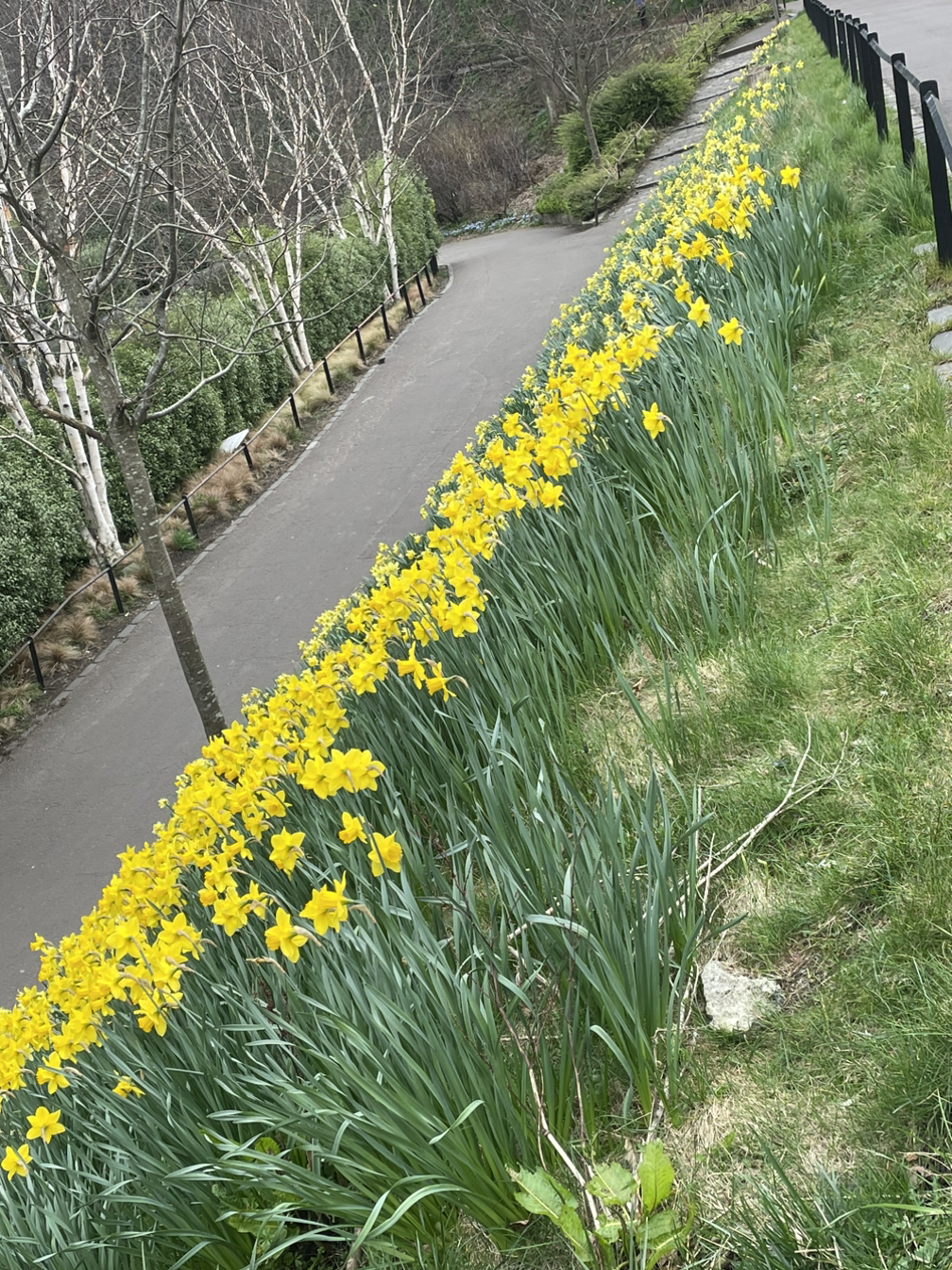 영국에 와서 열흘 쯤 지난 지금, 내심 나를 많이 놀라게 만든 장면은 영국 땅, 들판이나 정원이나 집앞이나 강가나 산기슭, 어디에서나 초록색 잎들 속에 얼굴을 떨구고 피어있는 수선화였다. 우리나라에서도 봄이 되면 제주도나 남쪽 지방에서 쉽게 눈에 뜨였던 꽃이지만 영국에 와서 보니 어딜 가나 천지 사방에 수선화가 예쁘게 피어있는 것을 볼 수 있었다. 처음에는 그저 무심하게 수선화가 영국에도 많이 피는구나 정도로만 생각했었는데 눈길이 닿는 곳 어딜 가나, 너른 들판에, 공원에, 건물 앞에, 길가에 피어있는 것을 보고 그것들이 주위 풍경과 녹아있는 모습이 내 마음을 비집고 들어왔다. 런던의 대표적인 공원인 하이드파크에서부터 공원 내 여기저기에 넓디넓은 파란색 잔디 위에 피어있는 수선화에 주목하기 시작했다. 청초하게, 수줍게, 여리여리하게, 밝은 노란색으로 환하게 피어있는 수선화가 참으로 아름다우며 주위 풍경을 예쁘게 물들여 준다는 것을 느끼게 된 것이다. 런던을 떠나 에딘버러를 거쳐 인버네스에서 첫날 밤을 자고 난 후인 오늘따라 이곳 영국 북쪽의 오래된 도시 인버네스의 네스강 강변을 걸으면서 강가 기슭에 군데군데 무리지어 피어 있는 노란색 수선화 꽃들이 얼마나 눈에 예쁘게 들어오는지 마치도 그것들과 사랑에 빠지기라도 한 듯, 마음이 설레고 떨려왔다.