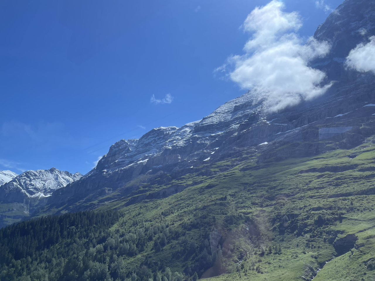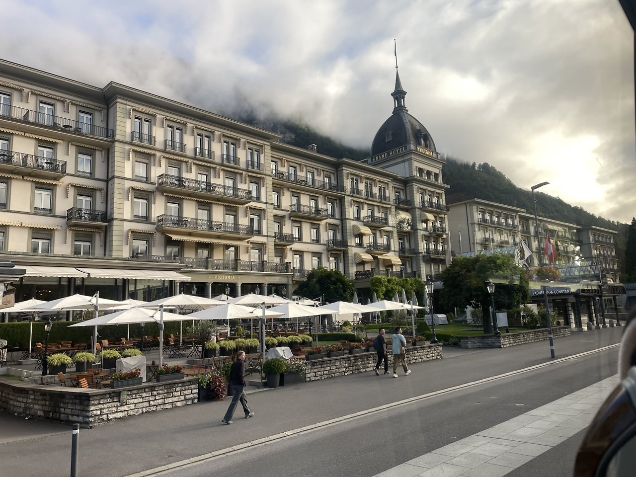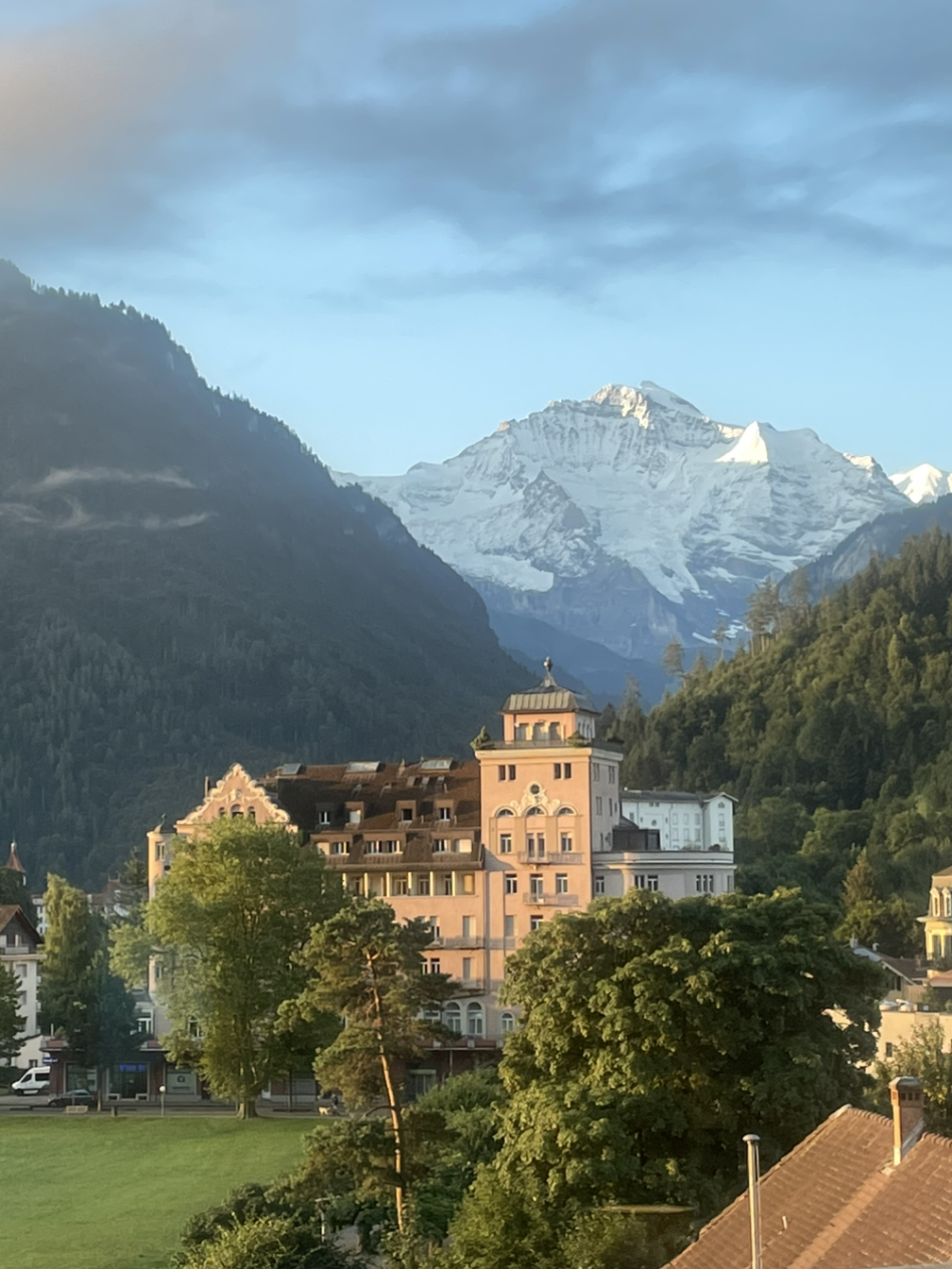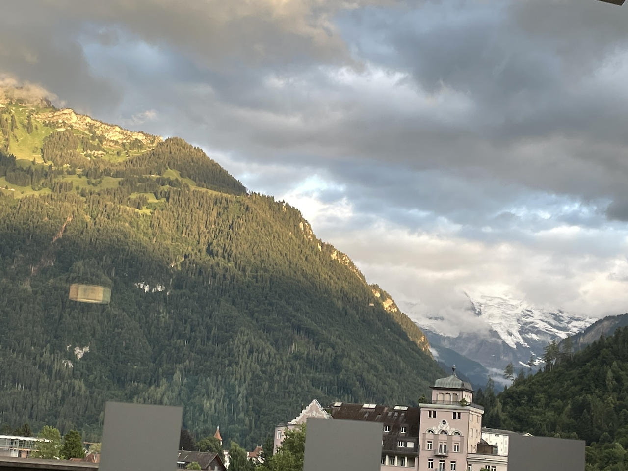 어찌됐든 우리 방에서는 전면의 산들이 막힘없이 바라보여서 조망이 매우 좋았는데 앞에 있는 산들 사이로 융프라우의 눈덮힌 봉우리가 빼꼼히 보여서 내일의 등정에 기대를 갖게 만들었다. 그러나 이미 실망했던 것처럼 예전의 그 풍부했던 눈들은 온데간데 없고 정상 부근에만 간신히 눈이 얹혀져 있는 것을 보니 누구 탓을 해야할지 모르는 안타까움과 아릿한 슬픔 같은 것이 찌르르 전해져 왔다. 기후변화 문제는 이제는 더 이상 방관자의 입장에서 왈가왈부하면 안된다는 심각한 경고를 하고 있는 지경에까지 이른 것 같다. 이렇게 비행기를 타고 다니는 것 자체가 오버투어리즘에 한발 담그고 있는 것인데 도대체 누구를 탓한단 말인가? 나 자신부터 자숙하고 책임감을 느끼고 상징적으로 손발을 묶는 퍼포먼스라도 해야 마땅할 듯한 죄책감을 느꼈다. 이제 앞으로는 먼 나라까지 날라다니는, 가고싶은 곳이라면 어디든지 마음대로 가던 여행은 지양해야 할 듯하다. 창문 밖으로는 유럽에서 이미 썸머타임을 적용하고 있는 까닭이어선지 저녁 9시까지도 산 봉우리에 노란 햇빛이 비쳐드는 것을 보고 언제 깜깜한 어둠이 찾아오나 신기한 마음으로 기다려졌다.