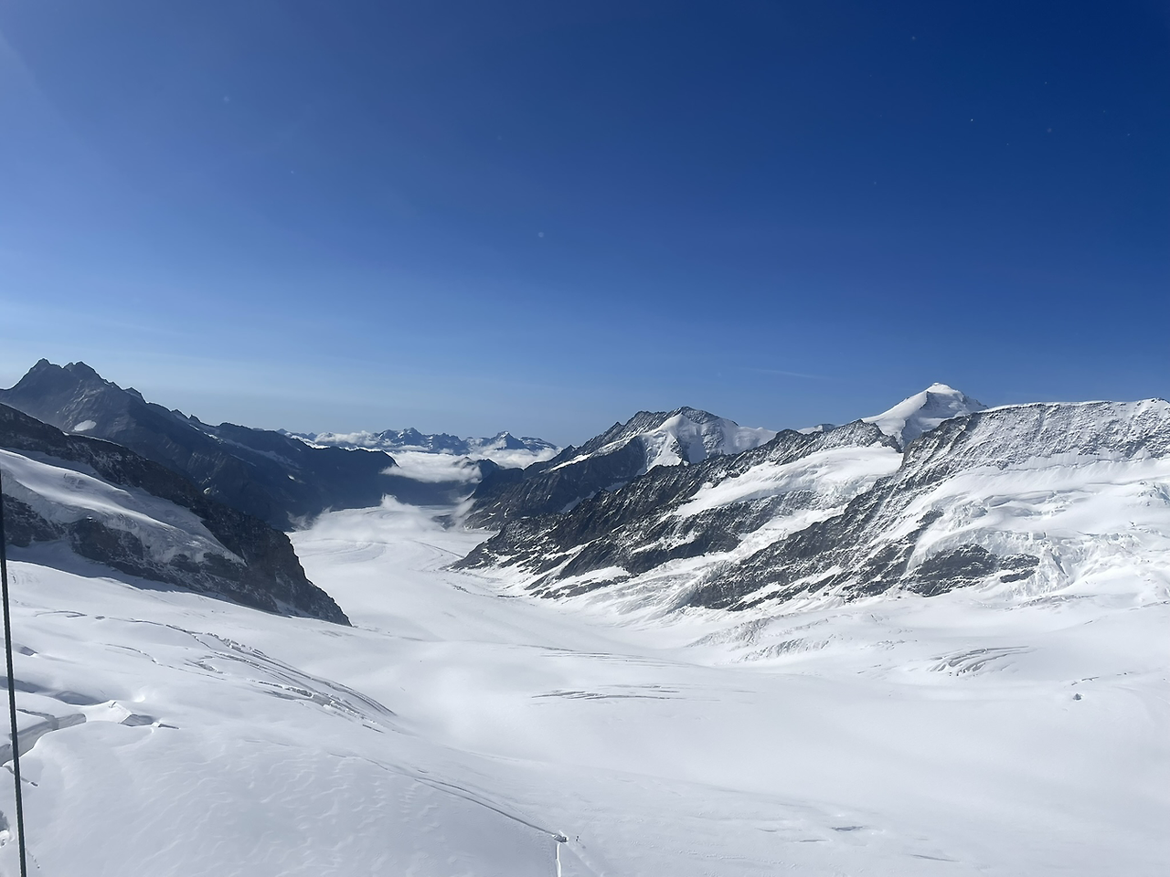 가이드가 아침부터 채근을 하는 바람에 조식도 일찍 먹고 차비를 해서 융프라우에 가기 전의 중간역인 그륀덴발트로 가는 기차에 8시에 올라탈 수 있었다. 그륀덴밭트에 내려서는 40년 전과 달리 케이블카를 탔는데 케이블카에 앉아서 내려다보는 산악지형의 풍경이 아주 그림 같았다. 예전 같으면 눈밭에 있어야할 집들과 계곡들이 초록색 초원을 끼고 군데군데 퍼져 있었다. 집들과 여기저기에 작은 골짜기를 타고 내려가는 계곡물과 능선 위의 소떼와 양떼들의 모습이 아름다웠다. 그것은 또 색다른 풍경이었지만 눈이 없는 풍경은 여전히 아쉬웠다. 케이블카에서 다시 톱니열차를 바꿔타고 드디어 융프라우 요흐(Jungfraujoch)에 이르렀을 때는 역시나 예전처럼 반짝반짝 빛나는 눈밭이 펼쳐져 있어서 반갑고 기뻤다. 그러나 기억과는 달리 걸어갈 수 있는 지역이 너무 제한적이어서 어리둥절해졌다. 역시나 많이 달라진 모습이었다. 옛날에는 정상 부근까지 얼마든지 오랫동안 돌아다닐 수 있었는데 말이다. 융프라우가 얼마나 더 오래 명성을 유지할 수 있을지 시간문제가 아닐까 생각해 보았다. 지구인 모두에게 지극히 슬픈 문제가 아닐까. 가슴이 쓰라려왔다.