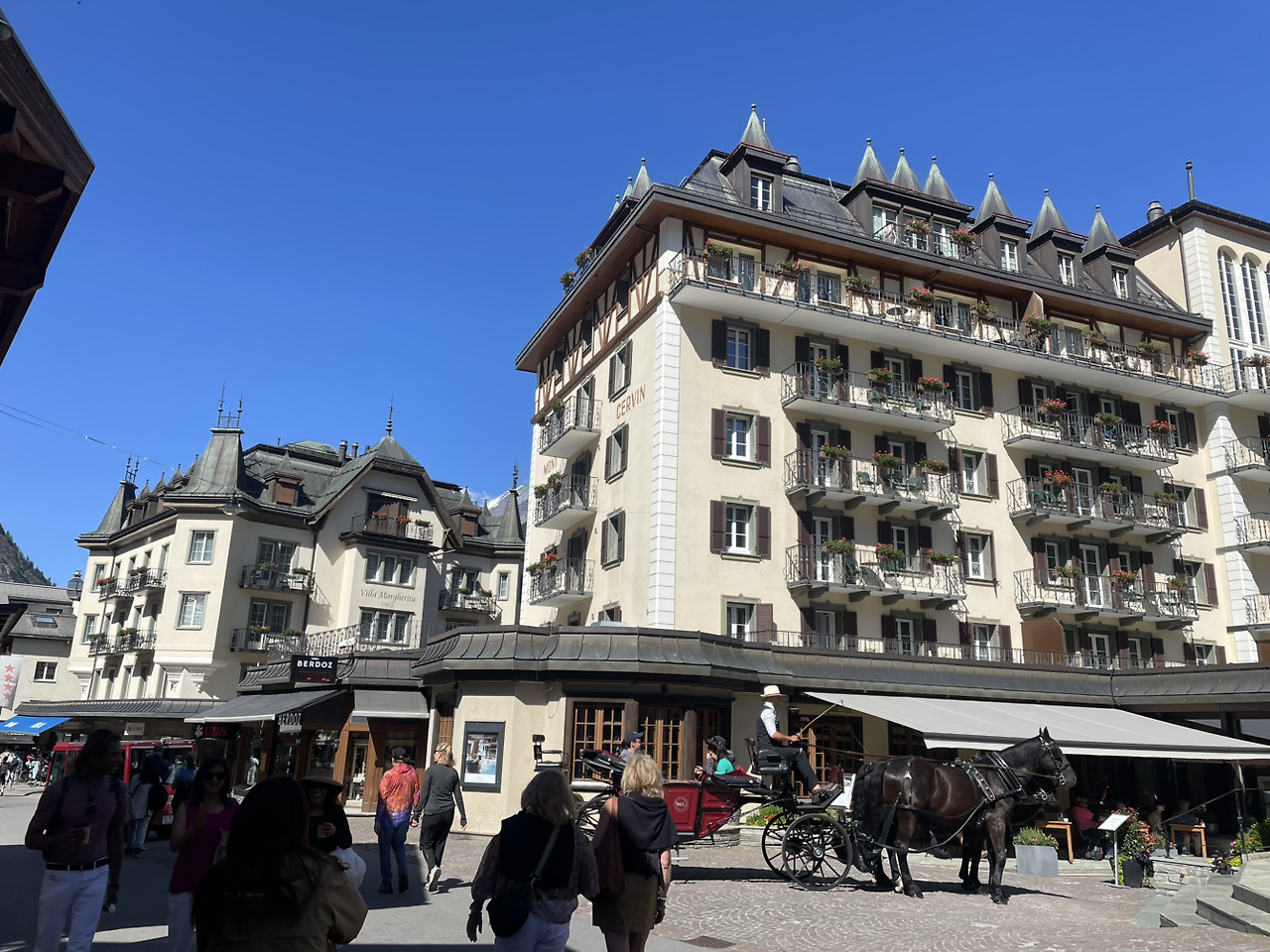 나에게 가장 인상적이었던 도시는 체르마트와 몽트뢰였다. 그 두 도시는 나의 예전 스위스 방문에서 빠진 도시였기 때문에 내가 이번에 처음으로 방문한 도시여서 그런지는 모르겠다. 체르마트에서 더욱 좋았던 것은 세 명이 자기에 꽤 넉넉하게 분리된 룸이 하나 더 있어서 처음으로 오랜만에 공간적으로 쾌적함을 느낄 수 있어서 좋았고 도시 분위기도 아늑하고 친근감이 들어서 더 좋았던 것 같다. 도시라고 하기에는 매우 작은, 마을이라고 부르면 딱 맞을 크기에 사람들의 발걸음이 빈번한 큰 도로를 사이에 두고 양쪽으로 늘어선 가게와 식당들, 호텔들이 과거의 스위스와 크게 다르지 않은 전통적인 분위기와 느낌을 주었다. 우리들은 자유식으로 점심을 사 먹은 후에 여행사에서 선택관광으로 내놓은 고르너그라트 트래킹을 가지 않기로 해서 오후 일정을 자유롭게 길게 즐길 수 있었다. 골목에 줄지어선 가게들을 기웃거리며 작은 성당에도 들어가 보고 뮤지엄도 들르고 무슨 기념품을 사면 가장 잘했다는 소리를 들을까 고심하면서 이곳저곳 가게에도 들어갔지만 딱히 눈에 띄는 것이 없어서 애초부터 사려고 작정했던 물건외에는 쇼핑을 하지 못했다. 친구 하나는 남편의 관절염에 좋다는 젤 연고를 사고 나는 옛날부터 쓰던 버터통의 덮개가 금이 가서 유럽에 오면 꼭 사리라 마음 먹었던 대로 스테인레스 스틸로 된 버터통(Butterdose)을 하나 샀다. 치즈칼도 하나 살까말까 망설였으나 너무 날카로운 치즈칼의 모습에 약간의 공포심이 생겨 그만두고 말았다. 메인거리라고 해봤자 아무리 걸어다녀도 두 세번 왕복하는 데 한 시간밖에 안 걸리는 소도시의 제일 끝에 있는 언덕길을 오르자 저 멀리에 마터호른(Matterhorn)의 웅장한 자태가 비교적 잘 눈에 들어와서 우리는 감격하며 그 앞에서 여러 장의 사진을 찍고 또 찍으며 즐거워했다. 거리 가운데쯤 되는 곳에서는 스위스 전통 복장을 입은 소그룹으로 조직된 스위스호른 음악대가 연주를 하기도 해서 듣고나서 힘껏 박수를 쳐주기도 하면서 오후 시간을 원없이 즐겼다. 이곳에서라면 저녁에도 카페의 야외 의자에 앉아 간단하게 술 한잔 하며 거리에 오가는 사람들 구경도 하면 꽤 재미있을 거라 생각했지만 어찌된 일인지 방에 올라가서 샤워를 하고나자 그 생각은 완전히 잊어버리고 자느라 바빴다.