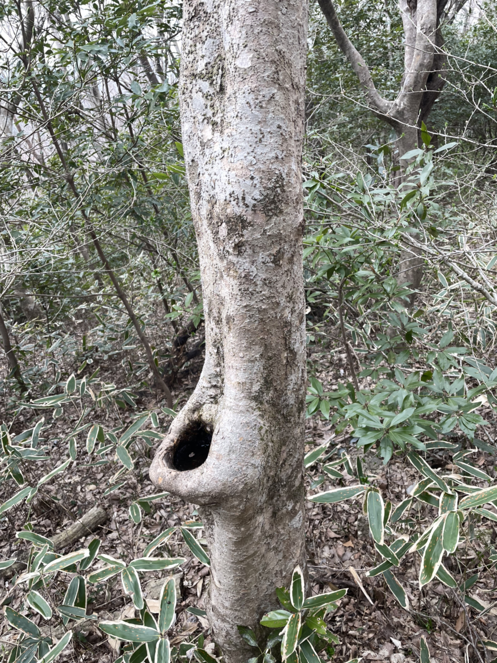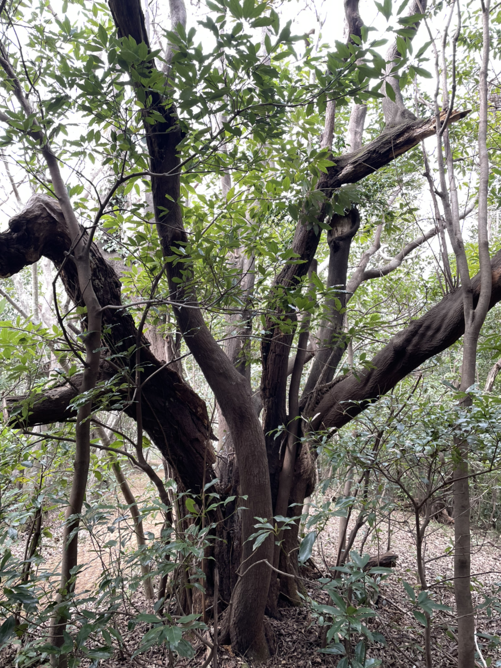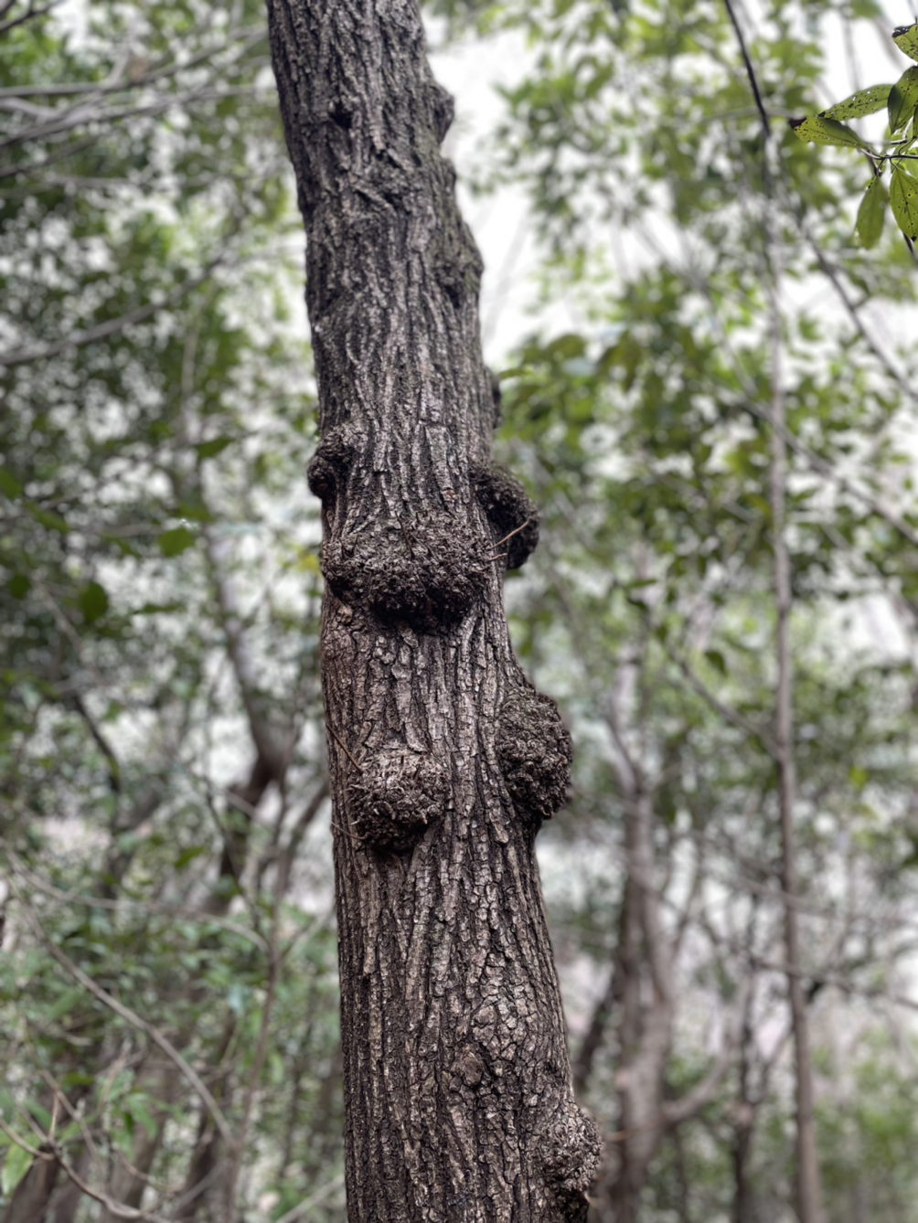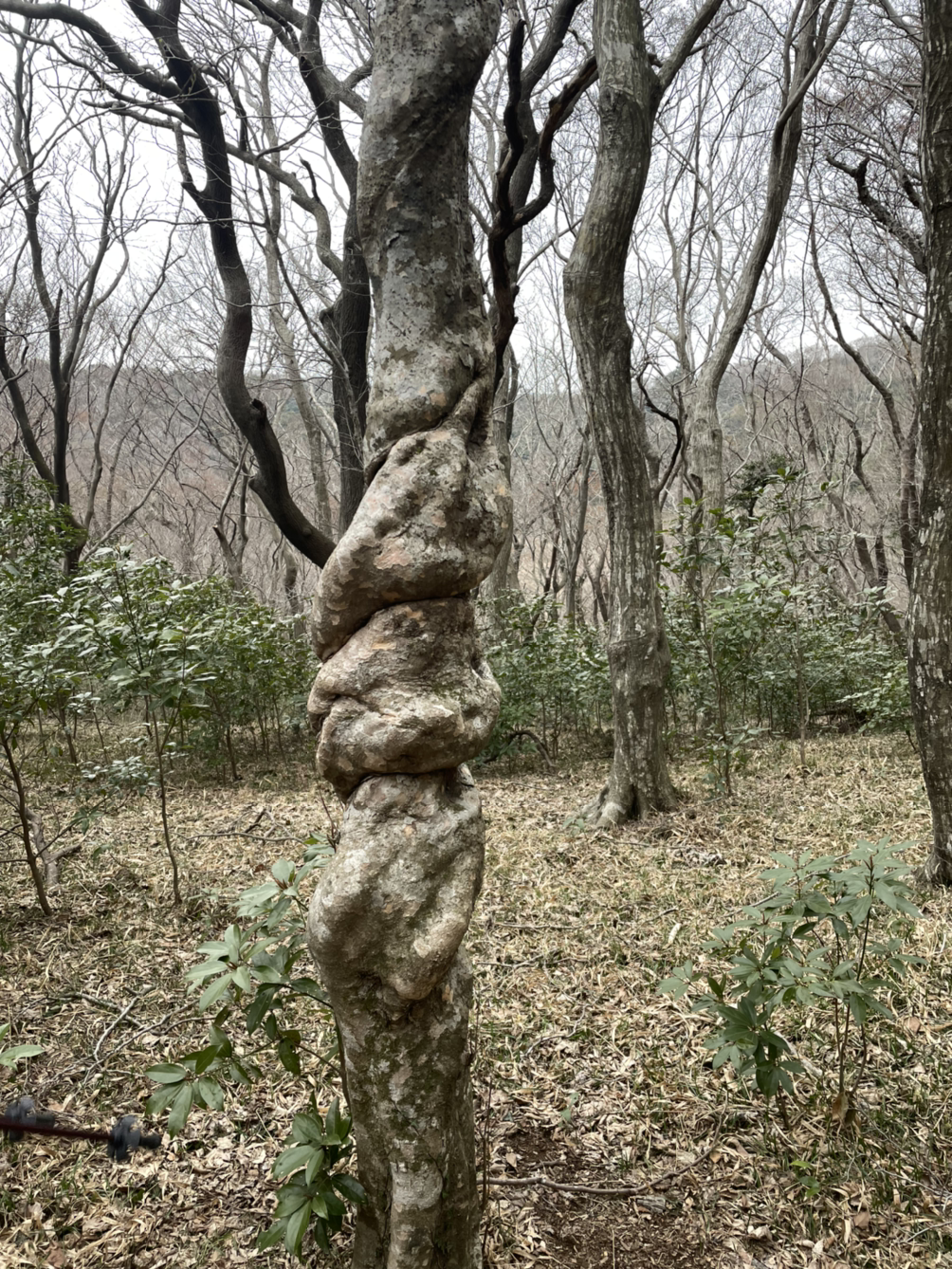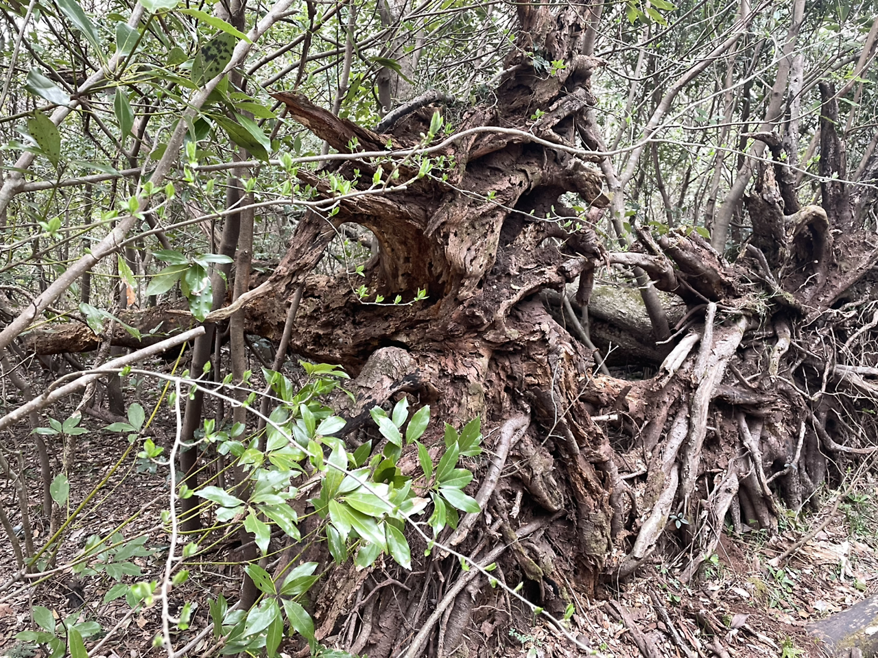 그 다음부터 이어진 길에는 바닥에 굵고 두꺼운 야자매트가 깔려 있었으므로 완만한 경사로를 올라갈 때까지는 힘이 별로 안 들었다. 그런데 내가 어제 유독 나무들에 관심이 많아져서 였는지 아니면 특별하게 붉은오름들의 나무들이 별다르게 보여서 였는지는 모르지만 올라가는 길 양옆으로 특이하게도 신기한 나무들이 많이 보였다. 원래도 제주의 곶자왈 같은 곳을 가면 기기묘묘한 나무들과 바위들이 얽혀있는 모습에 눈을 크게 뜨고 놀라게 되지만 이 붉은오름의 나무들도 곶자왈의 나무들과 별로 다르지 않은 모습으로 특이하고 아름다워서 가다가 중간중간 발을 멈추게 만들었다. 나는 그때마다 귀찮음도 잊고 휴대폰을 꺼내 사진을 찍기에 바빴다. 다른 오름들과 달리 나무들 앞에 나무이름 팻말이 상당히 많이 붙여져 있는 것도 눈에 띄었다. 때죽나무, 참식나무, 산딸나무... 그밖의 더 많은 팻말들이 붙어 있었지만 안타깝게도 내 머리는 그 이상의 이름들은 기억하지 못 했다. 어쨋든 그런 종류의 나무들이 많이 분포된 지역 같았다. 대부분의 오름들(아니 이 말에는 어폐가 있다. 내가 오른 대부분의 오름들이라고 해야 맞다)은 인공조림으로 이루어진 숲들이 많았던 것에 비해 문외한인 내눈에도 이 붉은오름은 천연원시림에 가까워 보였다. 온대와 난대 한대 수종이 다양하게 분포된 원시림에 가까운 숲이라니 !! 그래서 올라가는 길에 훨씬 더 빈번히 주위의 나무들에 눈길이 갈 수밖에 없었다.