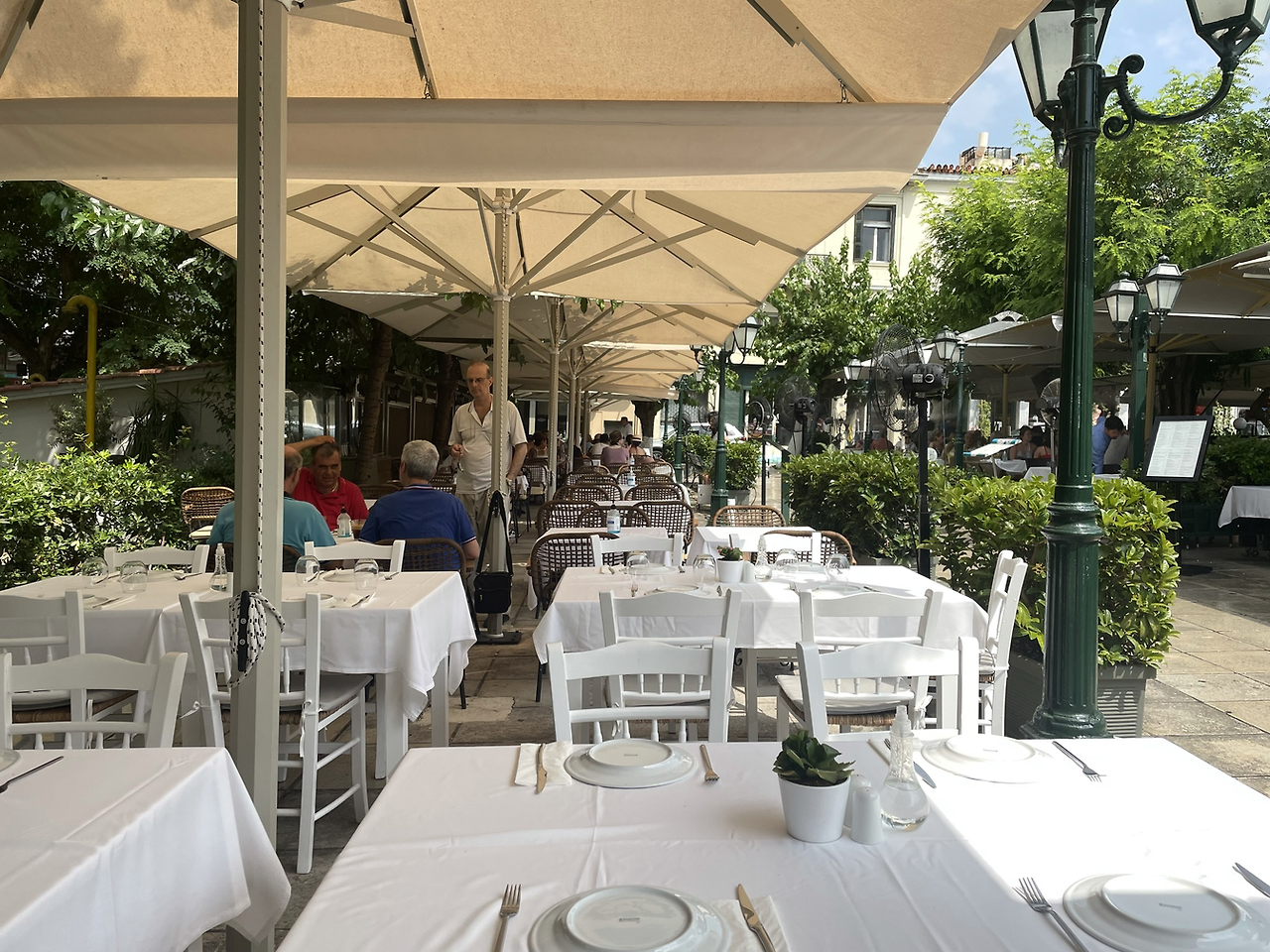 카페에서 나와 플라카 거리로 가기로 했다. 거기에서 점심을 먹고 아크로폴리스 쪽으로 갈 작정이기 때문이다. 플라카에는 그야말로 사람들로 북새통이었다. 우리도 그렇지만 코로나로 막혔던 세계가 뚫리니 너도나도 보복여행(Revenge Travel)에 나선 것인지 예전보다 더욱 사람들이 많아 보였고 사람들의 표정도 행복감에 넘쳐 보였다. 우리는 익숙한 플라카 거리를 걷다가 예전에도 한번 먹은 적이 있는 파스타 집에 갈까 하다가 조금 더 널찍하고 하얀 테이블보가 유난히 반짝거리는 식당으로 들어가 앉았다. 거기에서 문어튀김과 무사카, 그릭 샐러드를 먹고 레치나를 마셨는데 양도 조금씩 나온데다가 나중에 계산할 때 보니 값도 생각보다 엄청 비싸서 결과적으로 식당선택에 실패한 꼴이 되고 말았다. 그리스 식당에서 음식 양에 실망한 것은 이번이 처음이었다. 사실 그리스 음식은 질적으로 우수한 것은 물론이지만 양으로 승부하려는 듯이 보였던 적이 많았기 때문이다. 하얀 식탁보에 대한 댓가치고는 너무 비싼 듯 싶었다.