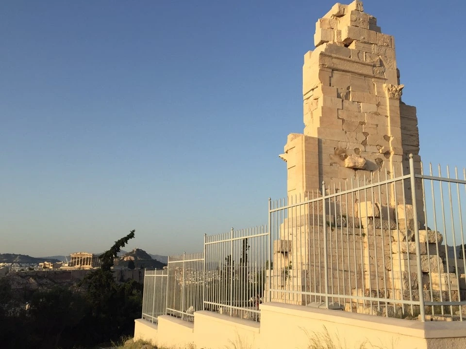 오른쪽으로 디오니소스 극장과 헤로데스 아티쿠스 음악당을 밖에서 보면서 걷다가 왼쪽편으로 소나무가 듬성듬성 서있는 언덕을 오르면 그곳이 바로 필로파포스 언덕이다. 그곳은 기원후 100년경에 로마에서 집정관으로 파견되었던 율리우스 안티오쿠스 필로파포스 사후 A.D.116년에 아테네 시민들이 그에 대한 존경심을 담아 그의 무덤을 만들고 기념비를 세운 곳이다. 지금의 기념비는 그 파사데의 삼분의 이 정도만 남아있는데 그럼에도 몹시 아름답다. 원래 여기엔 고대시대에 시인이 살고 있어서 뮤즈의 언덕으로 불리기도 했었다. 이 언덕에서 바라보는 아크로폴리스의 파르테논 신전은 거의 같은 눈높이로 보이기 때문에 다른 시각과 방향으로 볼 수 있고 아테네 시내 풍경도 시야에 가득 들어온다. 일몰 장소로도 멋진 곳이다.