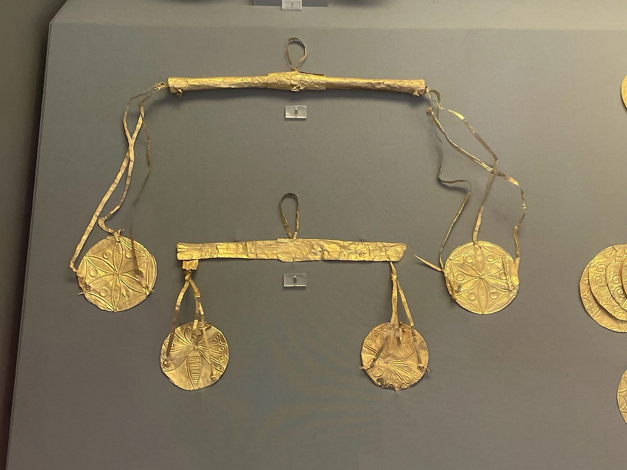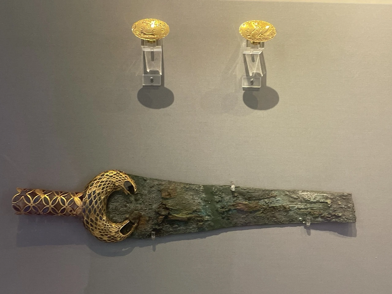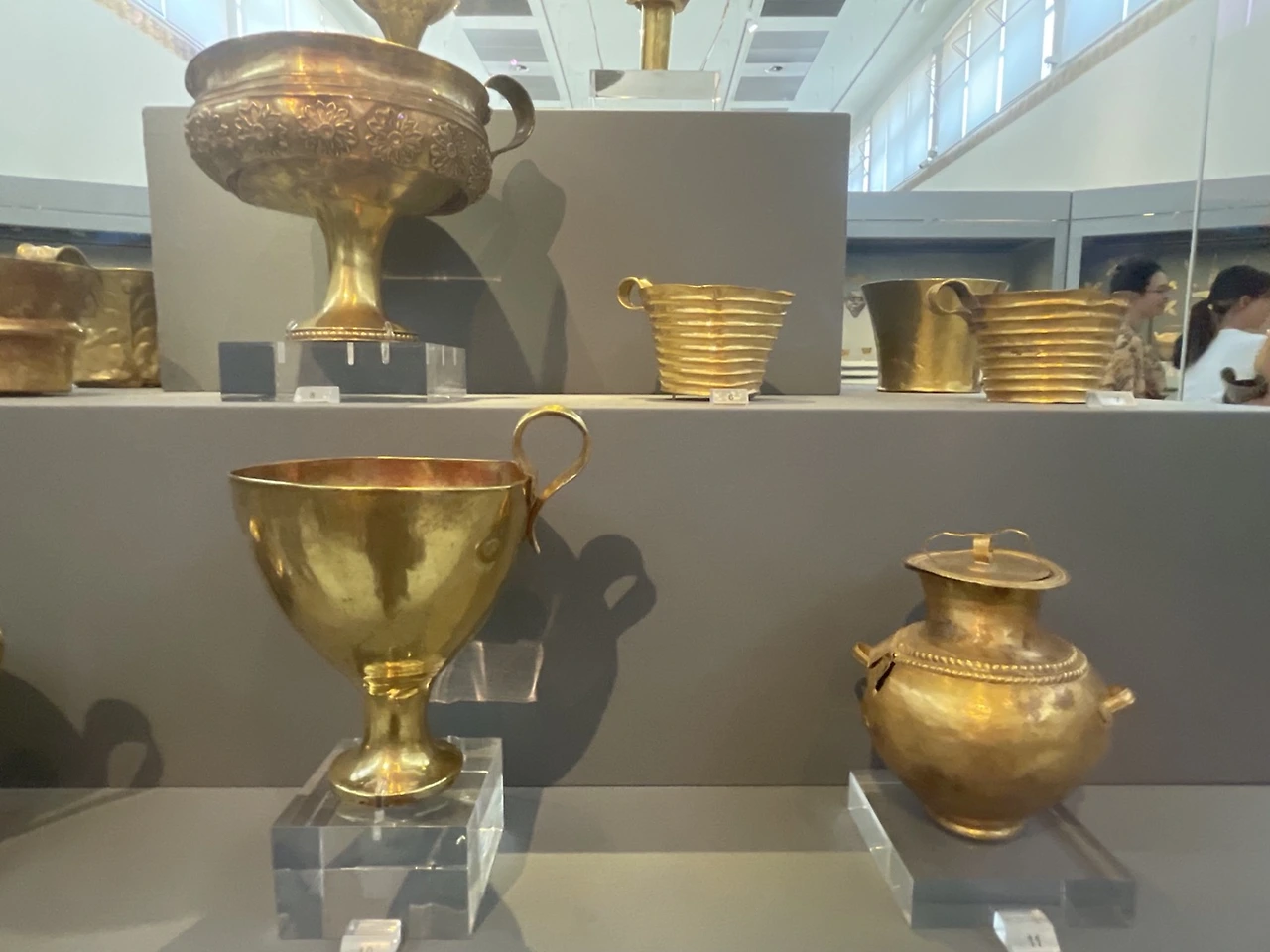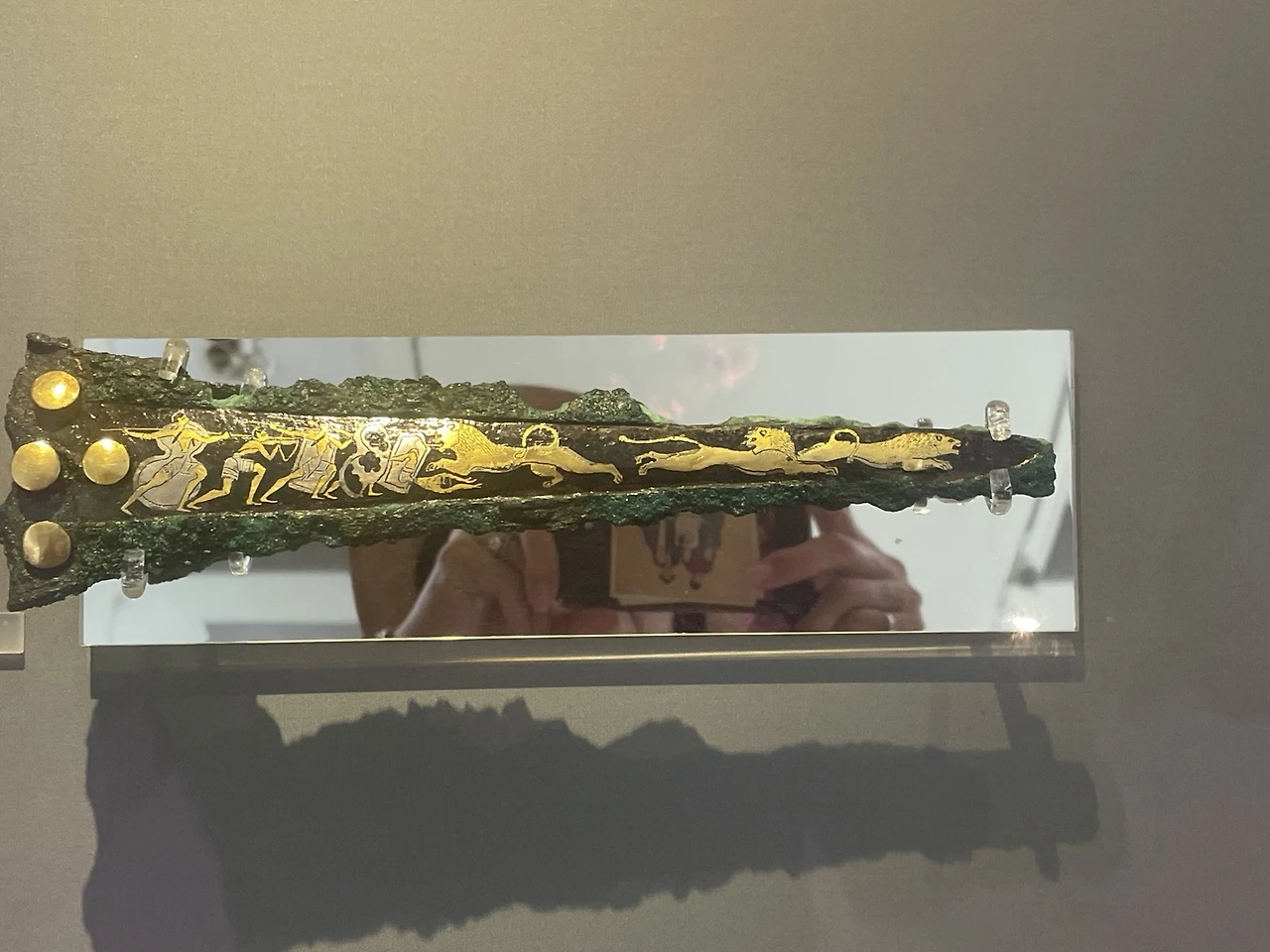 그 다음에는 부장품으로 함께 묻혔던 청동 칼들이 등장하는데 그 화려한 문양과 황금손잡이로 보아 당연히 왕들이 썼을 것으로 추정된다. 칼 등에 새겨진 정교한 문양의 부조들은 나중에 전시된 인장들에서도 발견되는데 그 정교함과 세밀함, 예술적 아름다움은 가히 세계 최고, 최상이라고 할 만하다. 도대체 그들은 저 옛날에 무슨 짓을 한 것인가. 그 다음에도 이어지는 수많은 장식품, 장신구들의 화려함, 아름다움, 정교함의 극치는 더 이상의 언급이 불필요할 정도다. 그 외에도 토기로 만든 인형들과 각종 포즈의 사람 피구린들(쟉은 조각상), 실생활에 사용됐던 토기와 접시들, 항아리들, 장식품 등의 높은 수준의 실용성과 예술성 등에 혀를 내두르게 된다. 놀라웠던 것들 중에는 그 당시에 이미 토기로 된 후라이팬이 있었고 청동거울이 있었고 뾰족한 항아리를 세워놓는 발 세개짜리 청동 받침대가 있었다는 사실이다. 또 내가 오랫동안 서서 뚫어지게 쳐다보게 만든 오리모양의 크리스털 꽃병?(그릇?)도 있었다. 설명에 의하면 산에서 캔 단 한 개의 크리스털을 파고 깎아서 만든 것이라고 한다. 그들의 수준은 이미 최상의(superb) 수준이었다는 것에 논란의 여지가 있을 수 없다.