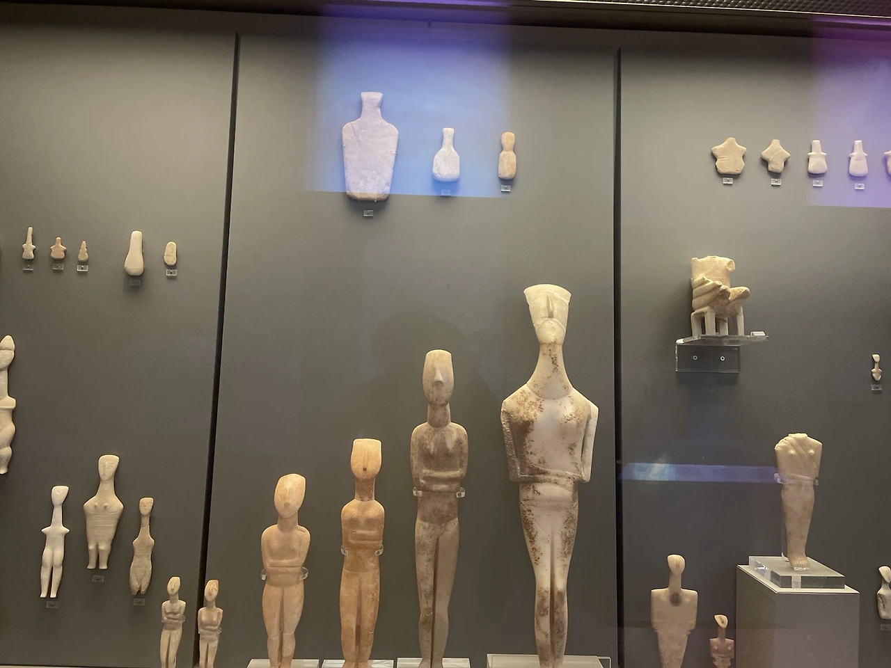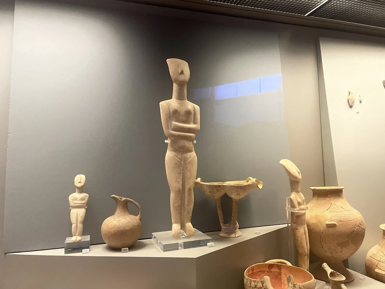 키클라데스 문명의(기원전 3000~ 2000 년경, 키클라데스 군도의 초기 청동기 시대 에게해 문명의 하나 ) 작품들 중 가장 눈에 띄는 것은 두팔을 겹쳐 앞에서 포개고 서있는, 하얀 대리석으로 만든 키클라데스 여인상(Female Cycladic Idol)이고 그것이 후에 크기가 커져서 발전하여 청년남자 모양의 쿠로스와 처녀 모양의 코레 등이 되었다(아크로폴리스 박물관에 있는 머리를 땋아내리고 채색을 한 코레는 그 중 가장 유명함). 또한 크레타 문명의 영향을 받은 프레스코화도 그 색깔의 선명함과 표현된 동작들의 역동성 등에서 높은 예술 수준을 짐작케한다.