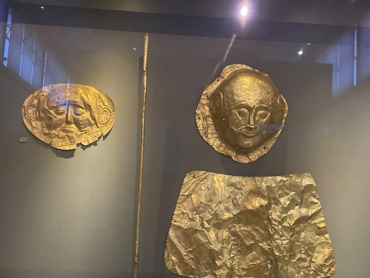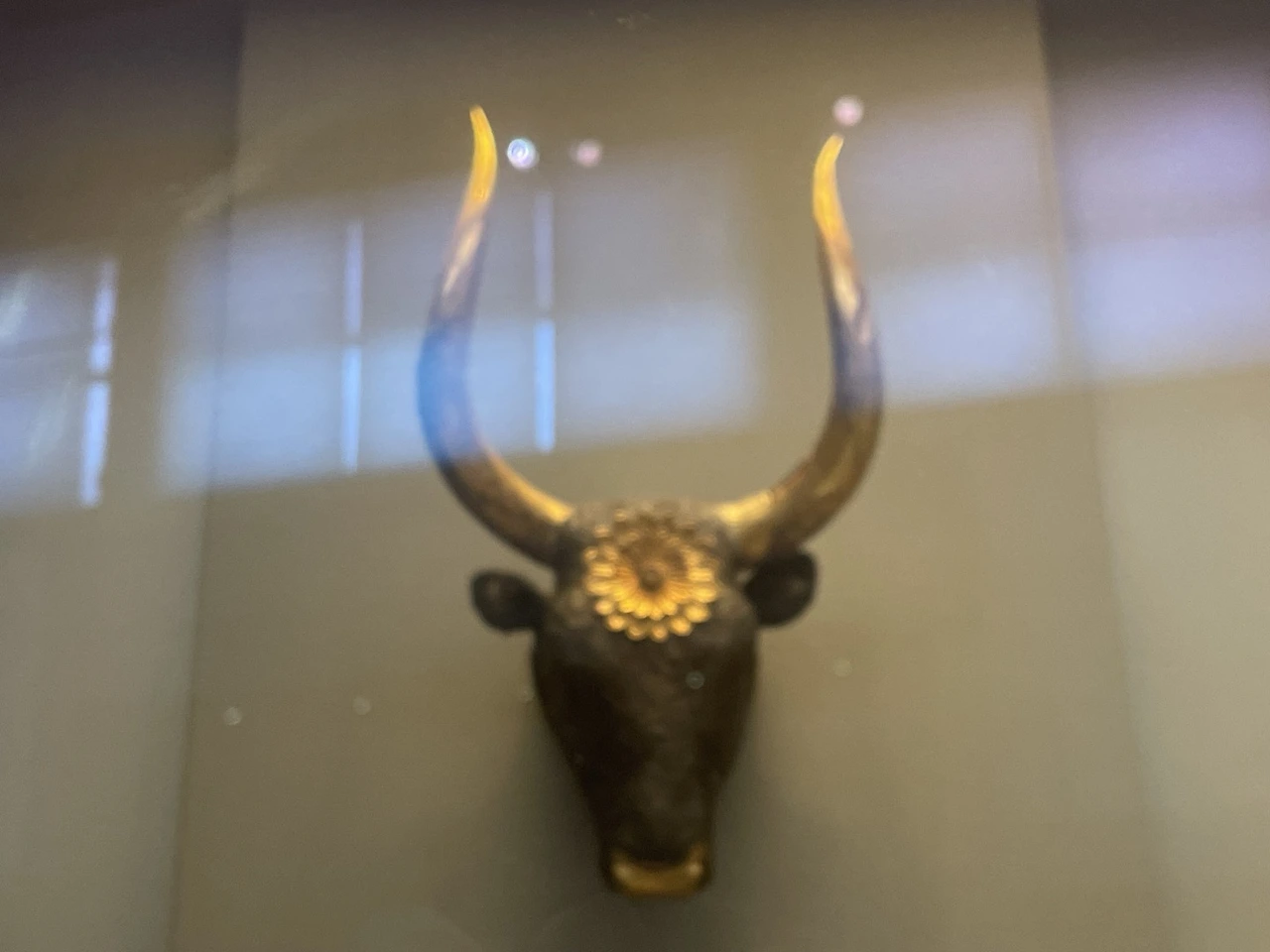 나는 잠시 떨어져 있던 연인을 만나러 가는 것처럼 들떠서 가슴을 두근거리며 전시실로 들어섰다. 1층 전시실은 미케네(Mycanae)문명의 유물들로 시작된다. 전시실에 들어가면 맨 처음 눈에 띄는 것이 뿔 달린 검정소의 머리 부분이다. 미케네의 Grave Iv에서 발굴된 것으로서 양쪽의 뿔이 날렵하고 길게 뻗어있는데 반짝반짝 빛나는 금으로 되어있고 이마에 있는 장미문양의(Rosette) 동그란 꽃과 입도 금으로 만들어졌다. 그 옆의 사자 얼굴은 완전히 온통 금으로 되어있다. 정교함과 아름다움, 사실성, 예술성 등에서 처음에 보았을 때 헉, 하고 말을 잊게 만들었던 작품인데 그 놀라움은 끝없이 이어진다. 그 다음 코너로 돌아서면 그 유명한 ‘아가멤논의 황금마스크’가 관람객을 맞는다. 이 황금 마스크들은 한 두개가 아니다. 순금을 종이처럼 얇은 금속판으로 만들어서 눈과 눈썹, 코, 입을 실제 얼굴에 꼭 맞는 크기로 만든 데드마스크였다. 이것들을 보는 순간 미케네 문명의 금세공 기술이 얼마나 미친 수준이었는지 인정하게 된다. 이것들은 Grave circle A에서 발견된 것들이다. 아가멤논의 황금마스크는 그런데 나중에 발견된 자료에 의하면 아가멤논 보다 150~200년 이상 앞선 것이라고 하니 아직도 논란의 여지가 많지만 이제는 워낙 유명해져서 그냥 아가멤논의 황금마스크로 통한다.