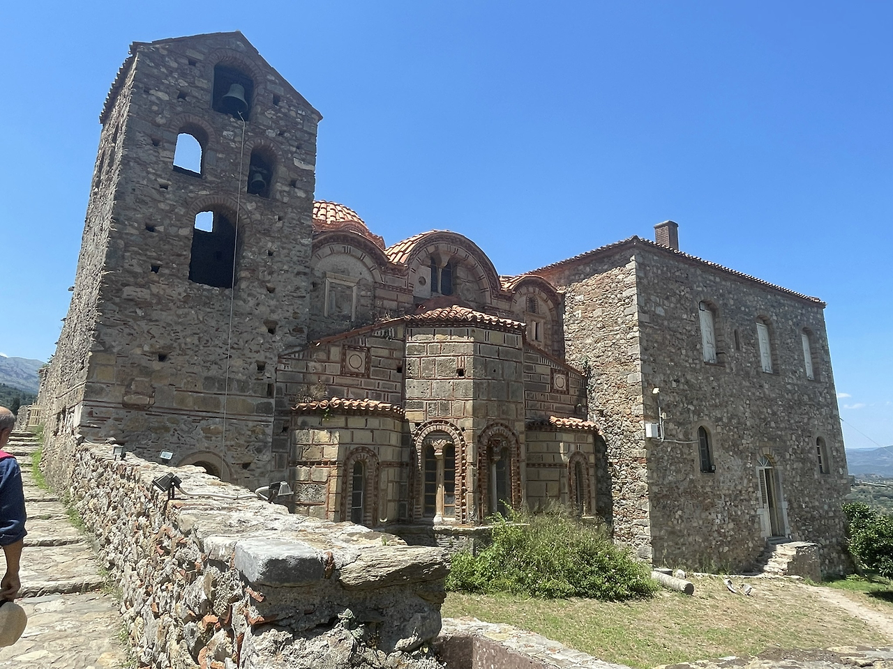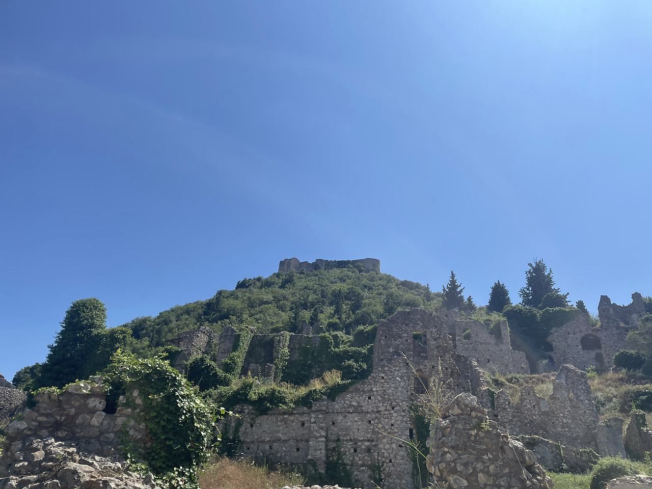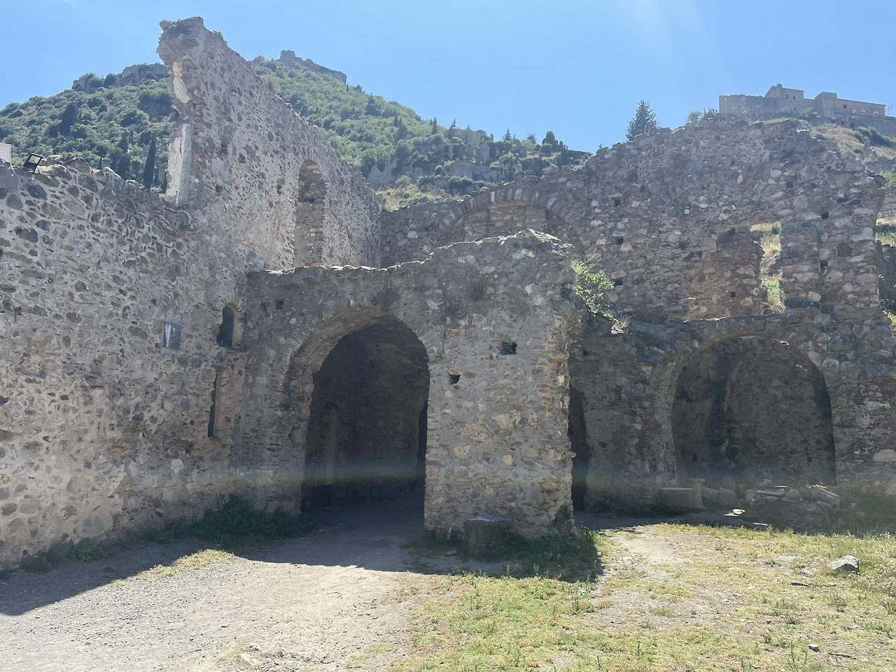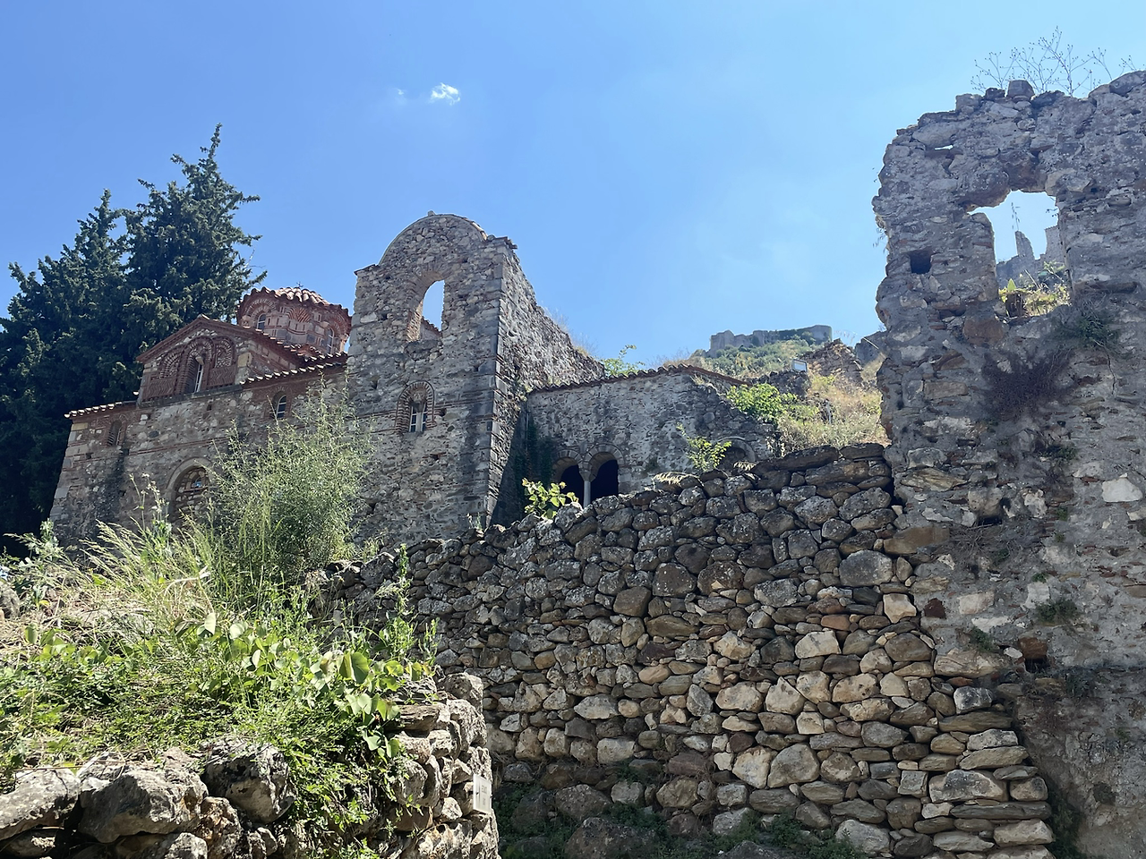요새는 정문을 지나고도 한참 더 올라가야 해서 더운 날씨에 꼭대기까지 가려면 상당한 각오가 필요해 보였다. 그래도 여기서 그만둘 수는 없는 일, 젖먹던 힘까지 내기로 했다. 꼬불꼬불한 계단을 한참이나 올라가니 드디어 요새의 끝이 보였다. 다 올라가서 내려다 보니 저 아래까지 성채의 건물들이 보였고 더 아래에는 저 멀리 스파르타 도시의 모습도 보일 정도로 높은 지점이었다. 나는 비로소 미스트라스까지 온 소기의 목적을 이루었다는 안도감에 마음이 상쾌해졌다. 그러나 몸은 지칠대로 지쳐서 다시 또 내려가야 하는 길을 보며 긴장이 느껴졌다. 요새 위는 넓은 공간은 아니었지만 그 옛날의 병사들이 순찰을 돌며 쉬고 활동하기에는 무리가 없어 보였다. 군데군데 병사들이 몸을 뉘였을 사각형의 공간이 천장은 떨어져 나간 채 앙상한 벽들만이 남아서 시간의 흔적을 느끼게 해주었다.