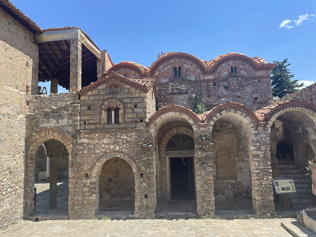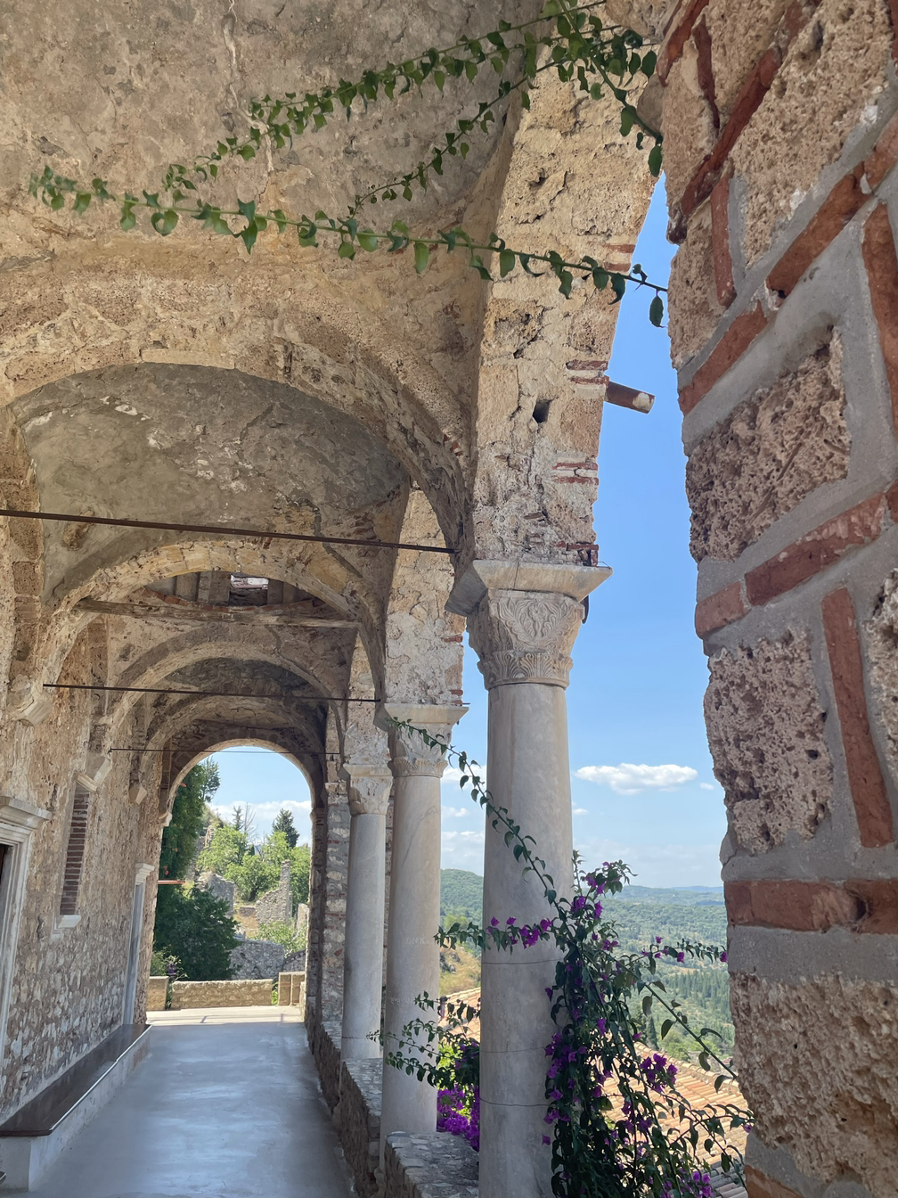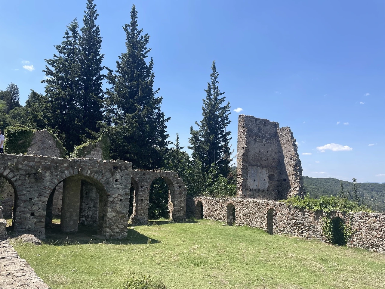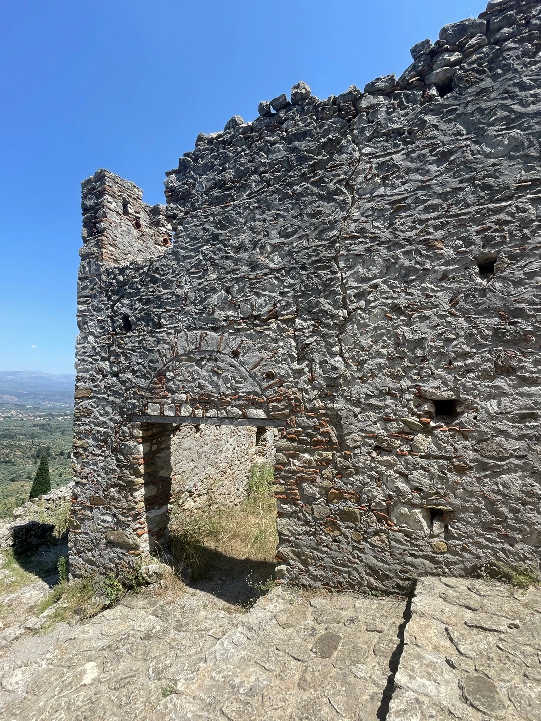 요새는 정문을 지나고도 한참 더 올라가야 해서 더운 날씨에 꼭대기까지 가려면 상당한 각오가 필요해 보였다. 그래도 여기서 그만둘 수는 없는 일, 젖먹던 힘까지 내기로 했다. 꼬불꼬불한 계단을 한참이나 올라가니 드디어 요새의 끝이 보였다. 다 올라가서 내려다 보니 저 아래까지 성채의 건물들이 보였고 더 아래에는 저 멀리 스파르타 도시의 모습도 보일 정도로 높은 지점이었다. 나는 비로소 미스트라스까지 온 소기의 목적을 이루었다는 안도감에 마음이 상쾌해졌다. 그러나 몸은 지칠대로 지쳐서 다시 또 내려가야 하는 길을 보며 긴장이 느껴졌다. 요새 위는 넓은 공간은 아니었지만 그 옛날의 병사들이 순찰을 돌며 쉬고 활동하기에는 무리가 없어 보였다. 군데군데 병사들이 몸을 뉘였을 사각형의 공간이 천장은 떨어져 나간 채 앙상한 벽들만이 남아서 시간의 흔적을 느끼게 해주었다.