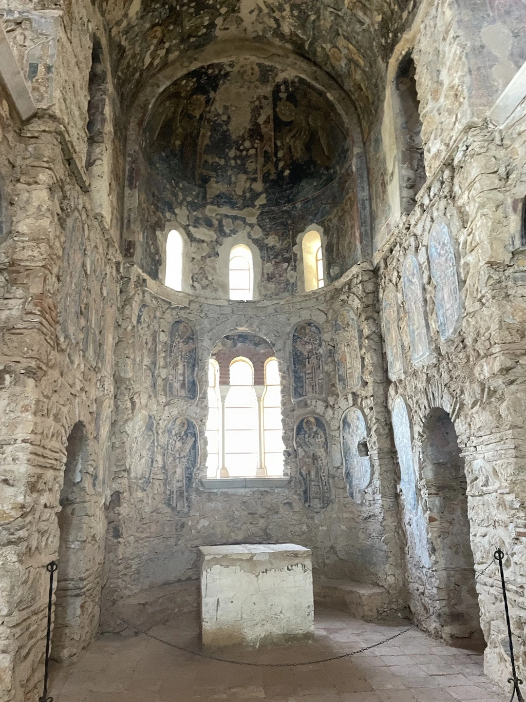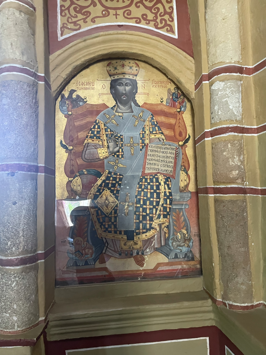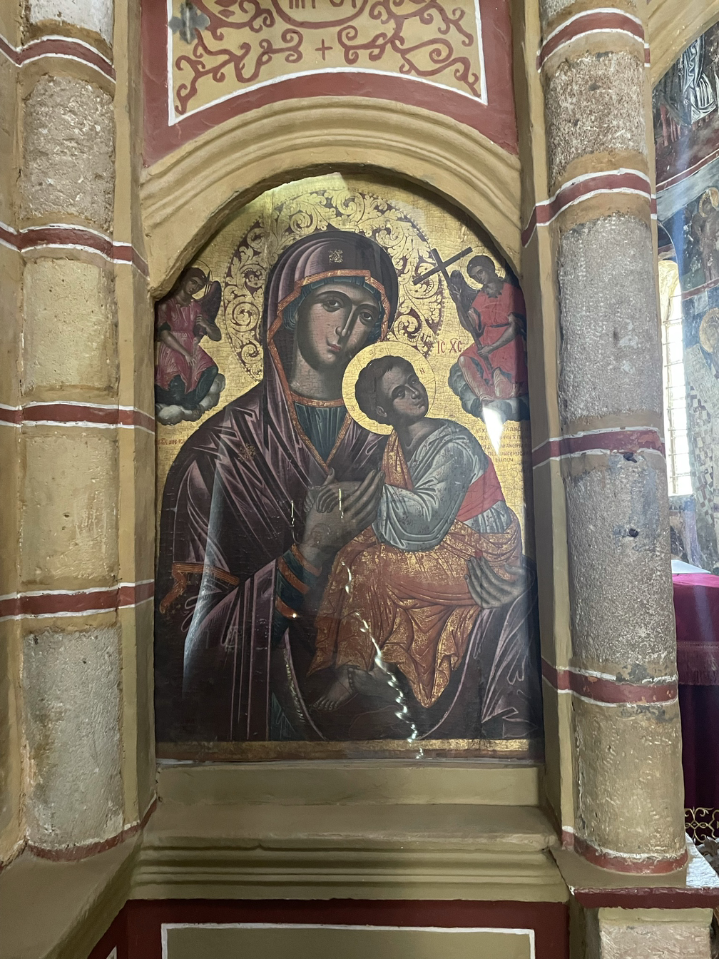 오래된 건축물이 주는 느낌은 참으로 이상하다. 건물이 아주 화려하거나 정교하거나 보존이 잘 되어 있거나, 않거나에 상관 없이 그저 가슴 서늘하게 아름답다. 성곽이나 돌담들은 거의 손도 대지 않은 채 허물어진 모습이 대부분이었는데 그것들은 또 너무 쓸쓸해 보여서 가슴을 찌르르 자극했다. 건축물도, 동물들도 식물들도 인간들도 언젠가는 이지러진 모습으로 쇠퇴하고 죽는다. 그래도 가장 오래 모습을 유지하며 살아남는 것이 돌로 된 건축물이다. 그러나 <생자필멸> 의 법칙을 거스를 수 있는 것은 아무것도 없다. 무너진 폐허들이 쓸쓸한 까닭은 그것들이 언젠가는 다가올 우리의 운명을 예고하고 있어서 그리도 처연한 것일까? 이 마음을 단순히 동병상련으로 치부하고 말 것인가? 그건 아닐 것이다. 폐허는 폐허대로 말로는 설명할 수 없는 미학적 아름다움을 간직하고 있다. 퇴색되고 변형되고 무너진 채로. 이곳의 비잔틴 건물들은 대개 둥그런 돔 모습의 지붕이 많고 그것은 붉은 벽돌색이었으며 기둥과 벽의 누런 황토색들과 잘 어울렸다. 안으로 들어가면 돔의 둥그스런 지붕 안쪽에 예수님 상이 프레스코화로 아름답게 그려져 있고 그 그림들은 대부분 잘 복원되어 선명한 색으로 눈길을 끈다. 그 중심의 회랑을 좌우 앞뒤, 십자형의 회랑들이 아치형으로 자리잡고 있다. 그리고 벽마다 코너마다 정성스레 그려진 이콘(성화)들이 장식되어 있다. 천장에서 길게 늘어뜨린 줄에 달려있는 샹들리에는 또 화려함의 극치를 이룬다. 그리스 정교회의 건물들의 내부에서 느껴지는 경건함은 카톨릭 교회의 그것과는 또 다르다. 훨씬 화려한 모습이어서 어리둥절 하게 만드는 한편으로 또 거기에 담긴 정성과 신심에 깊이 감동하게 만드는 이상한 힘이 있다. 그리스 사람들의 마음에 아직도 꺼지지 않는 등불처럼 타오르는 경건한 신앙심에 경의를 표하지 않을 수 없다.