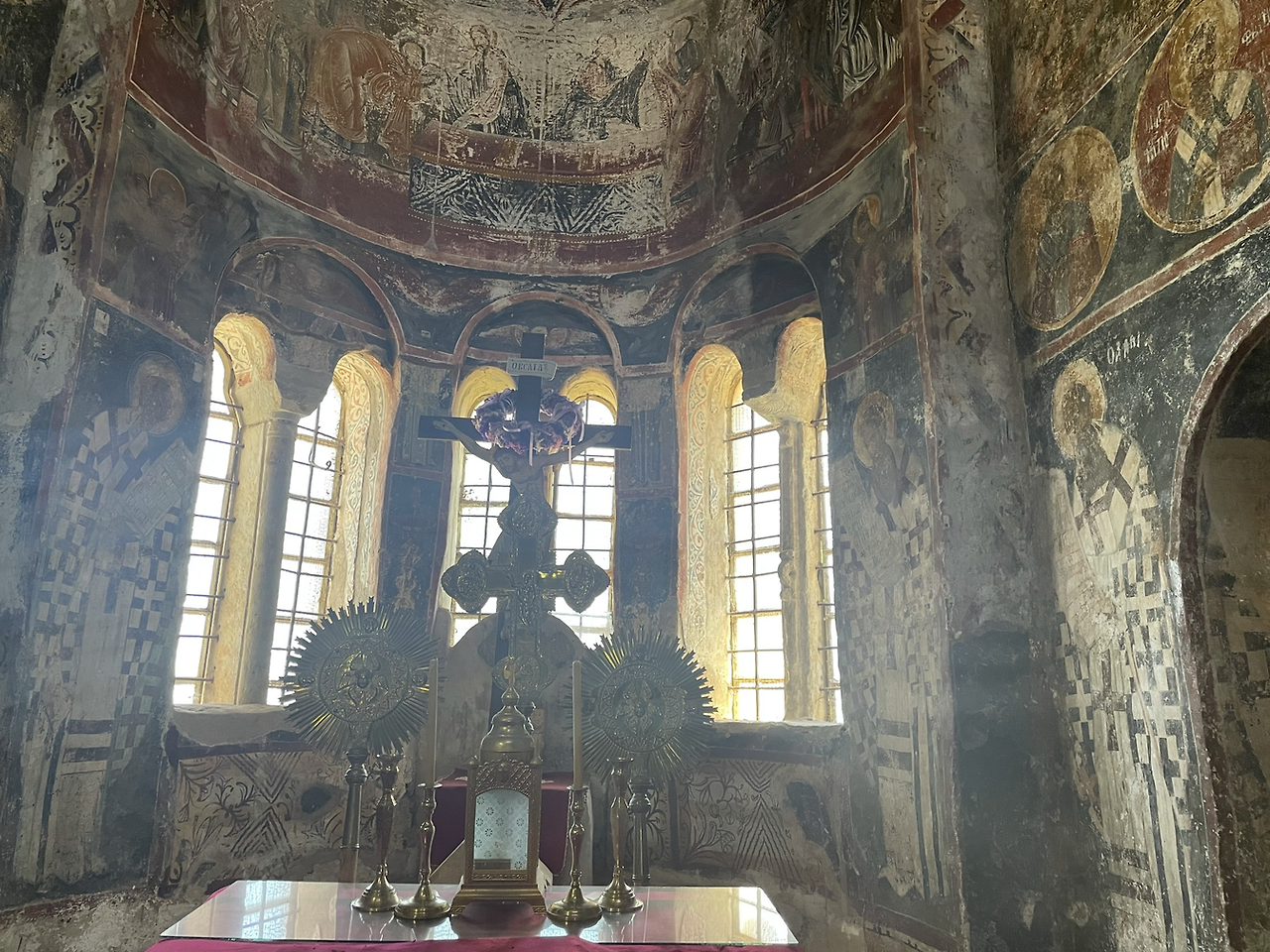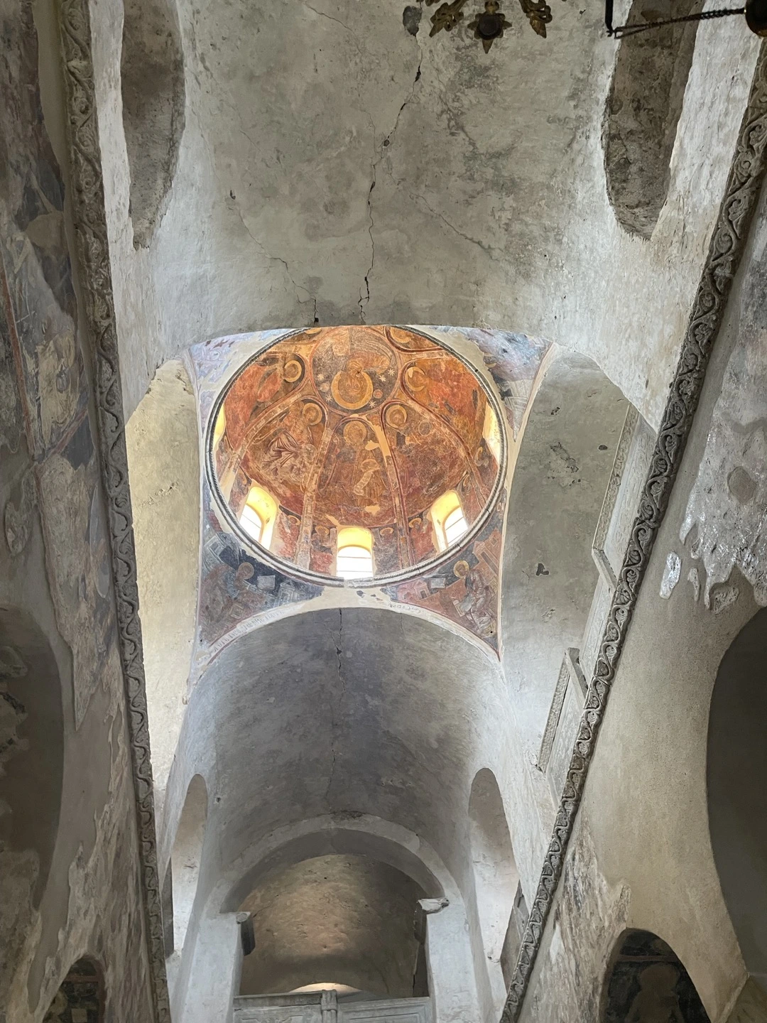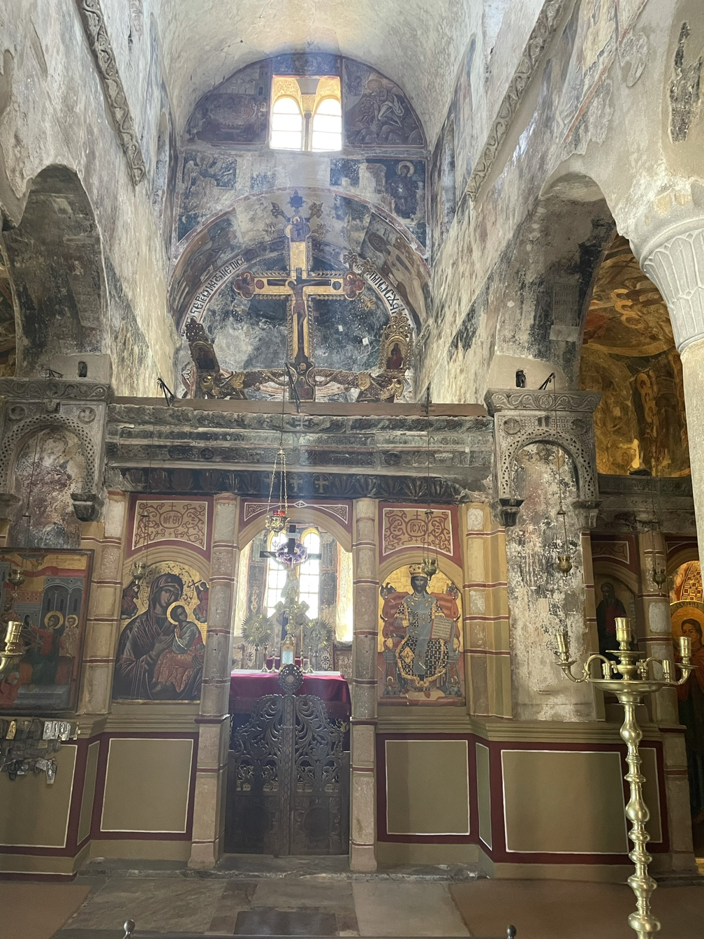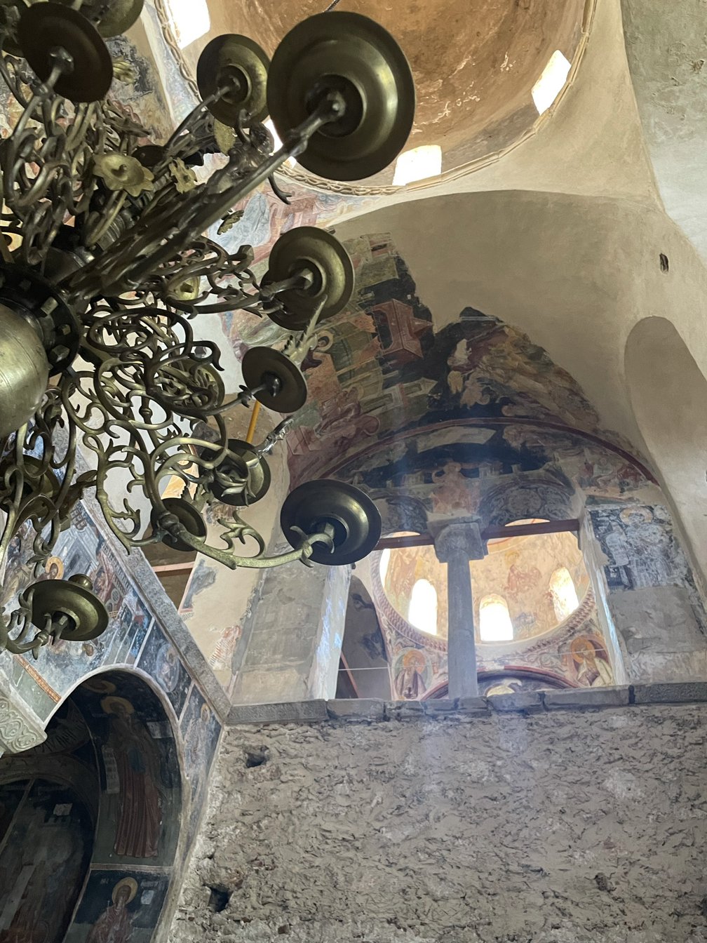 오래된 건축물이 주는 느낌은 참으로 이상하다. 건물이 아주 화려하거나 정교하거나 보존이 잘 되어 있거나, 않거나에 상관 없이 그저 가슴 서늘하게 아름답다. 성곽이나 돌담들은 거의 손도 대지 않은 채 허물어진 모습이 대부분이었는데 그것들은 또 너무 쓸쓸해 보여서 가슴을 찌르르 자극했다. 건축물도, 동물들도 식물들도 인간들도 언젠가는 이지러진 모습으로 쇠퇴하고 죽는다. 그래도 가장 오래 모습을 유지하며 살아남는 것이 돌로 된 건축물이다. 그러나 <생자필멸> 의 법칙을 거스를 수 있는 것은 아무것도 없다. 무너진 폐허들이 쓸쓸한 까닭은 그것들이 언젠가는 다가올 우리의 운명을 예고하고 있어서 그리도 처연한 것일까? 이 마음을 단순히 동병상련으로 치부하고 말 것인가? 그건 아닐 것이다. 폐허는 폐허대로 말로는 설명할 수 없는 미학적 아름다움을 간직하고 있다. 퇴색되고 변형되고 무너진 채로. 이곳의 비잔틴 건물들은 대개 둥그런 돔 모습의 지붕이 많고 그것은 붉은 벽돌색이었으며 기둥과 벽의 누런 황토색들과 잘 어울렸다. 안으로 들어가면 돔의 둥그스런 지붕 안쪽에 예수님 상이 프레스코화로 아름답게 그려져 있고 그 그림들은 대부분 잘 복원되어 선명한 색으로 눈길을 끈다. 그 중심의 회랑을 좌우 앞뒤, 십자형의 회랑들이 아치형으로 자리잡고 있다. 그리고 벽마다 코너마다 정성스레 그려진 이콘(성화)들이 장식되어 있다. 천장에서 길게 늘어뜨린 줄에 달려있는 샹들리에는 또 화려함의 극치를 이룬다. 그리스 정교회의 건물들의 내부에서 느껴지는 경건함은 카톨릭 교회의 그것과는 또 다르다. 훨씬 화려한 모습이어서 어리둥절 하게 만드는 한편으로 또 거기에 담긴 정성과 신심에 깊이 감동하게 만드는 이상한 힘이 있다. 그리스 사람들의 마음에 아직도 꺼지지 않는 등불처럼 타오르는 경건한 신앙심에 경의를 표하지 않을 수 없다.
