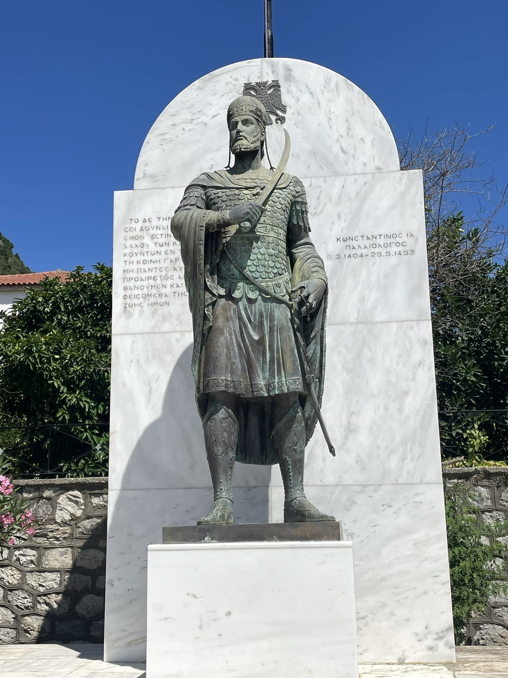 1264년에 세워진, 성 데메트리오스에게 봉헌된 메트로폴리스는 비잔틴제국의 비극적 운명과 마지막을 같이 한 제국 최후의 황제 콘스탄티누스 11세가(미스트라스 성채 아래 동네 중요 지점에 그의 동상이 서 있다) 약식 황제 대관식(정식 대관식에서는 정교회 세계총대주교가 주관해야 하나 미스트라스에는 그가 없었음) 을 통해 황제로 즉위한 곳으로서 교회 한 가운데에 목조로 된 화려하고 위엄이 있는 옥좌가 있고 바닥에는 대리석 석판에 비잔틴제국을 상징하는 머리 두 개 달린 독수리가 선명하게 새겨져 있다.