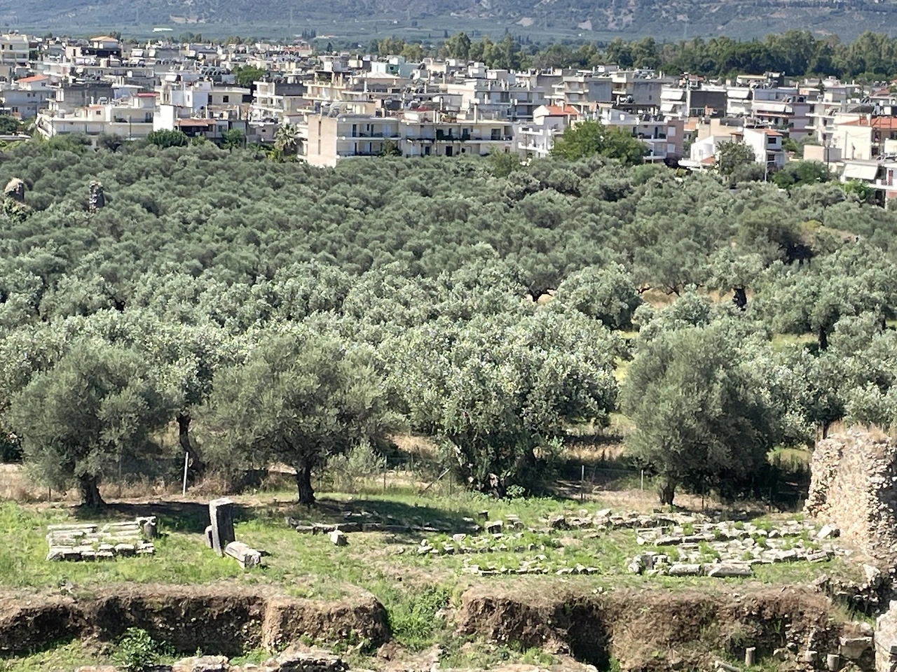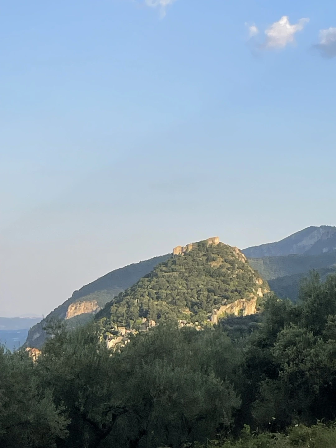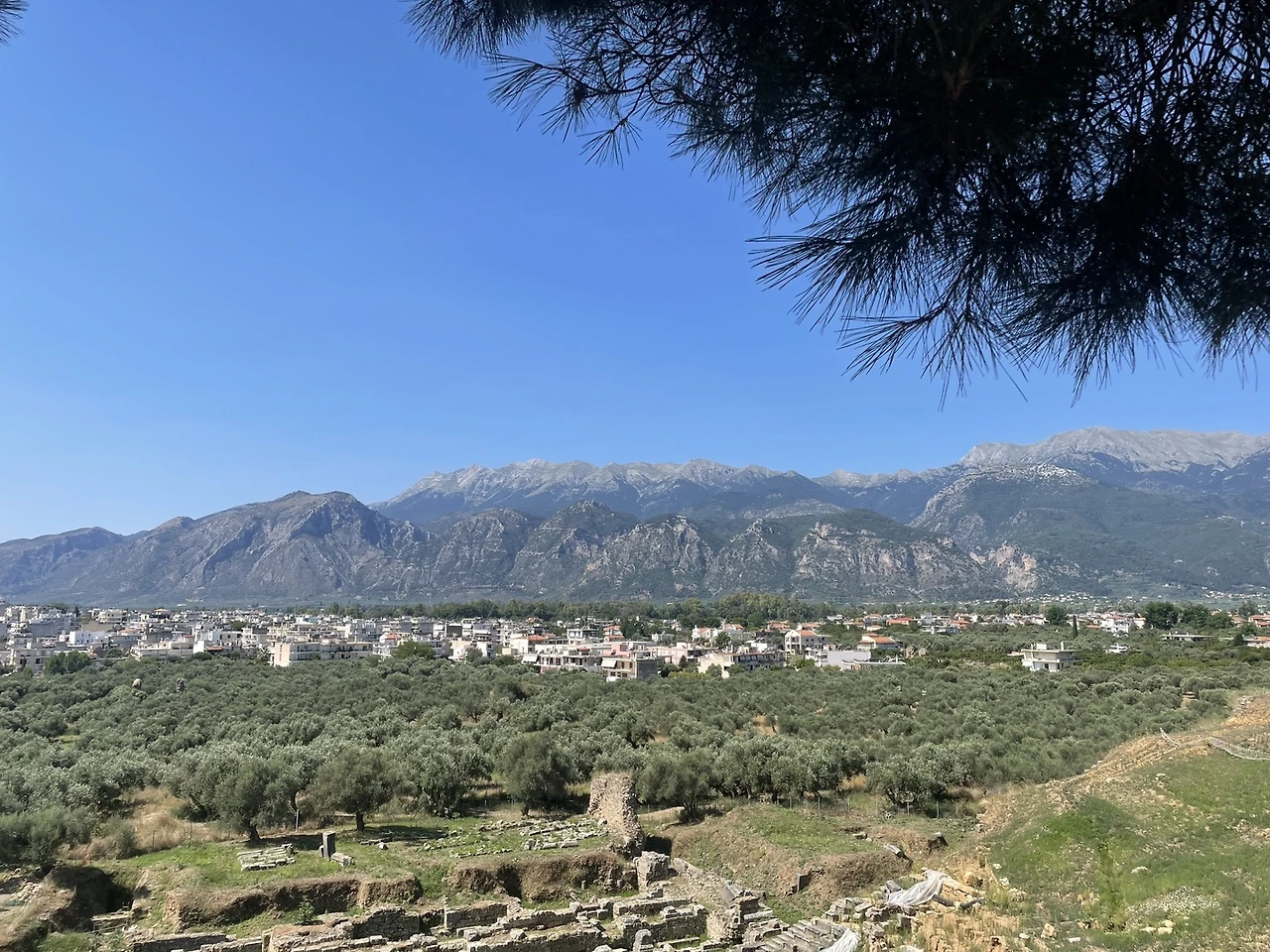과연 호텔은 요새가 있는 산의 성채들과(620m) 비슷한 높이에 있었다. 주차를 시킨다음 돌아보니 저 아래에 7km나 떨어진 스파르타가 발밑에 납작 엎드려 있는 것이 보일 정도로 높이 올라와 있었다. 나플리오에서도 위치 때문에 화가 났었으나 동화같은 분위기의 방 모습때문에 마음을 누그려뜨렸던 나는 이번엔 또 어떤 방이 나오려나 약간의 기대마저 하게됐다. 리셉션에 있는 직원이 아직 방이 정리가 안됐으니 한 시간쯤 후에 와 달라는 말에 따라 우리는 점심을 먹으러 동네산책겸 길을 따라 내려갔다. 리메니 호텔에서 10시쯤 체크아웃을 하고 일찍 떠나온 관계로 12시쯤이었으니 체크인 시간으로는 너무 일렀던 까닭이다. 주위의 평원을 한 눈에 내려다 볼 수 있을 정도로 산 중턱에 있는 작은 마을치고는 교회와 버스정류장, 작은 읍사무소 비슷한 것도 있었고 식당과 호텔도 각각 서 너개쯤이나 있는 듯 했다. 우리는 뭐 멀리 갈 것도 없이 가장 가까운 식당으로 갔는데 이번에도 운이 좋았는지 음식 맛이 썩 좋았고 나중에 보니 Tripadvisor에도 추천된 식당이었다. 남편은 램찹(양갈비 스테이크)을, 나는 포크수블라키를 시켜서 그릭샐러드와 함께 맛있는 점심을 끝냈다.