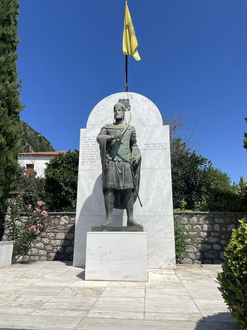 가게 밖으로 나와 사정없이 내려쬐는 햇빛 속에서 조금 걷다 보니 동로마제국의 마지막 황제였던 콘스탄티누스 11세의 동상이 보였다. 참으로 잘 생겼다고 말할 수 있는 그의 얼굴은 제국의 최후와 함께 한 그의 운명 때문이었는지 어딘가 침울한 빛을 감출 수 없는, 그늘이 드리워진 표정으로 보였다. 그 동상을 제작한 조각가조차도 비운의 황제 얼굴을 새기면서 많은 고민을 했으리라. 그는 미스트라스에서 대관식을(1449년) 거친 후 성실하게 황제직을 수행했으나( 그는 재위 기간 동안에도 그 이전에도 체통에 거슬리는 짓은 전혀 하지 않았으며 동로마제국의 고토 회복에 힘을 기울여 옛날에 잃었던 많은 영토를 수복해서 펠로폰네소스 반도의 거의 전 지역이 동로마제국의 영토가 되었다) 오스만튀르크의 메흐메트 2세의 끈질긴 공격으로 콘스탄티노폴로스의 방어가 위험해지자 직접 군대를 지휘하며 싸웠다고 한다. 이윽고 그 튼튼했던 3중 벽의 테오도시우스 성벽이 함락되자 그도 전사한 것으로 알려졌는데 황제의 지위를 나타내는 모든 표식을 몸에서 떼어낸 후의 일이어서 그의 시체는 결국 찾을 수 없었다고 전해진다. 그의 죽음과 함께 역사상 가장 길게 1100년 이상 존속했던 동로마제국(비잔티움제국)은 역사 속으로 사라지며 마지막황제였던 콘스탄티누스 11세의 (재위 1449~1453년) 동상은 그가 ‘모레아’의통치자로서 사랑해 마지 않았던 이곳에 세워지게 된 것 같다.