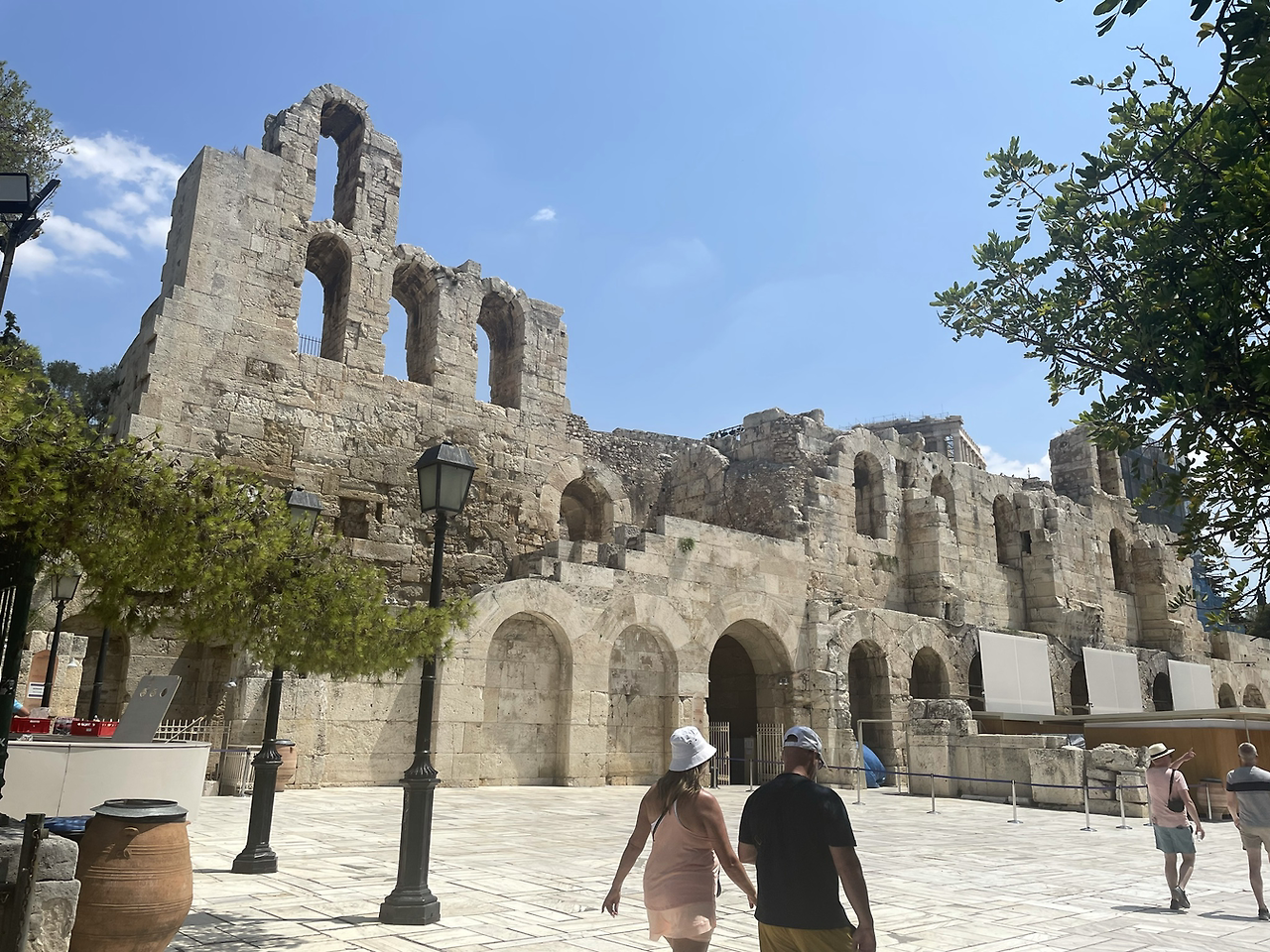 아레오파고스 언덕에서 내려오는 길에서 헤로데스 아티쿠스 오데온(음악당)을 보면서도 또 저렇게 아름다운 음악당은 어떻게, 누구의 머릿속에서 나온 생각으로 지어졌을까 감탄과 부러움 속에 올려다 보았다. 산의 지형을 이용해서 원형 계단을 대리석으로 배치하고 중앙무대 뒷편의 들어오는 입구 쪽은 몇 층의 아치로 건축한 그 음악당은 조형미만으로도 얼마나 뛰어나고 아름다운지 보고 또 보아도 질리지 않는다. 기원전 2세기경에 이렇게 멋진 음악당을 지을 수 있었던 그리스인들이라니!! 그러고보니 7년전쯤인가 그 극장에 들어가서 베르디의 오페라 <라 트라비아타>를 보았던 기억이 떠올랐다. 그리스국립오페라단과 러시아출신 한국계 소프라노가 협연한 무대였는데 음악성이 뚸어난 것은 아니었지만 여름 밤 야외음악당, 그것도 그리스 본토 아테네의 수천 년이 된 석조음악당에서 공연을 직접 보고 듣고 한 것만으로도 행복감이 고조되었었다. 관객들은 대부분 그리스 사람들로 보였는데 야회복으로 멋지게 차려입은 사람들도 많았고 수수하면서도 신경 쓴 듯한 옷차림을 하고 온 사람들도 많았었다. 일인당 단돈 20유로로 즐겼었던 화려한 여름 밤의 무대였다.