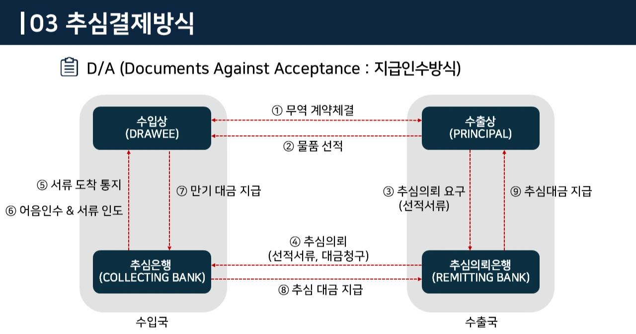 D/A 방식은 서류인도가 먼저 이루어지고, 대금은 일정기간 이후에 지급됩니다.