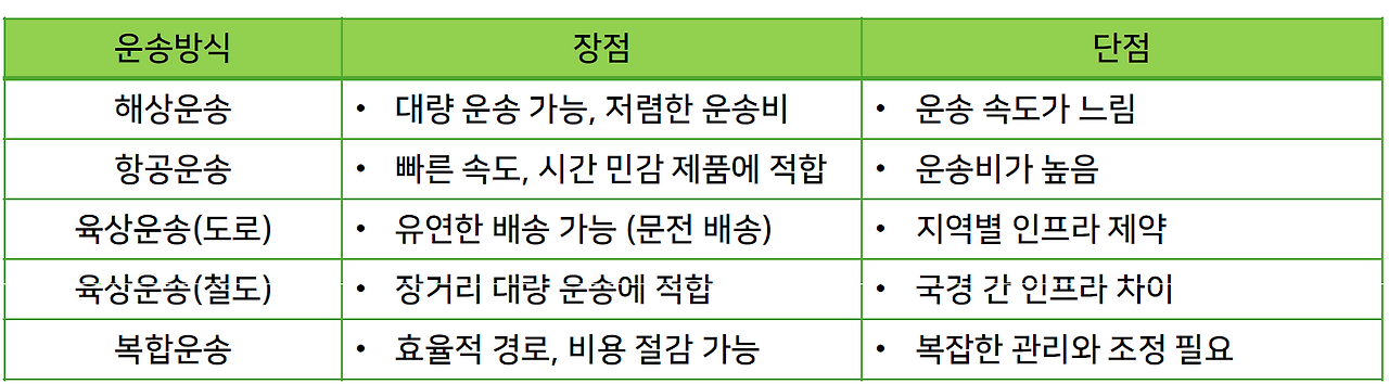 국가 간 상품 및 서비스를 이동시키기 위해 해상, 항공, 육상, 또는 복합 운송 방식을 말함. 효율적인 운송 방식 선택은 비용 절감과 거래 성공에 중요한 역할을 함
