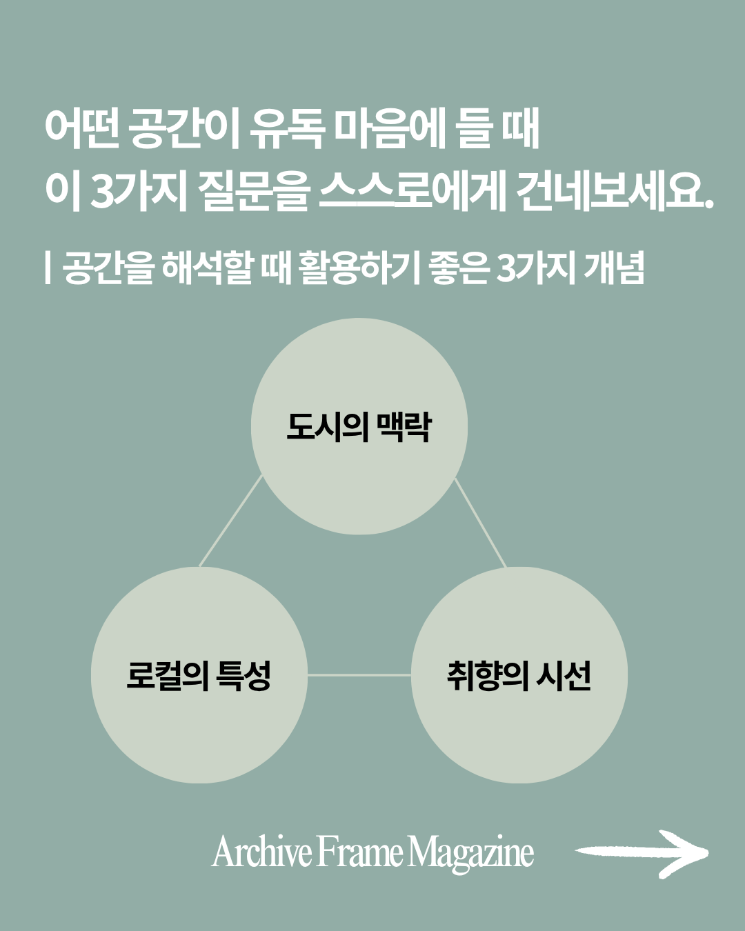 아카이브 프레임은 단순한 개인의 기록을 넘어서, 공간과 도시를 사랑하는 독자들에게 감각적이면서도 지적인 지도를 건네고자 합니다. 공간의 겉모습만 보여주는 것이 아니라, 그 공간이 어떤 문화적 배경, 시대의 흐름, 사람들의 삶과 취향 위에 놓여 있는지를 함께 읽어보려 합니다. 그 과정을 통해 독자 여러분이 단순한 관람자가 아니라, 탐구하고 사유하는 주체로 성장할 수 있도록. 그것이 이 매거진의 존재 이유이자, 앞으로의 방향입니다.