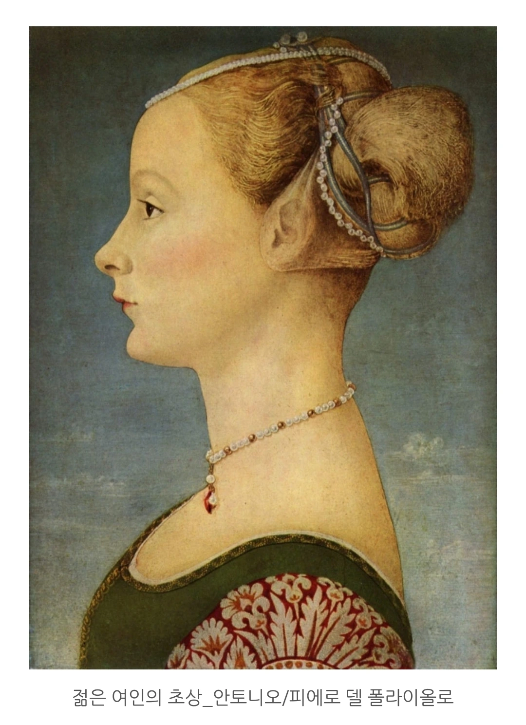 도슨트의 해설;르네상스 시대의 가장 유명한 초상화 중 하나입니다. 생생한 푸른 하늘을 배경으로 한 액자에, 여성의 옆모습의 섬세한 윤곽이 선명하게 표현되어 있습니다. 베일 아래 우아하게 정돈된 그녀의 머리카락은 섬세한 진주 목걸이로 장식되어 있습니다. 호화로운 옷차림 및 헤어스타일과 장신구는 피렌체 엘리트 계층 내에서 빼어난 인물로서 그녀의 지위를 암시합니다. 1470년경에 제작된 이 작품은 15세기 후반 안토니오(Antonio)와 피에로 델 폴라이올로(Piero del Pollaiolo)가 이끄는 피렌체 작업실에서 제작된 여성 초상화 연작의 주요한 부분입니다. 여성의 금발 머리, 진주, 보석, 피부색에 빛이 미치는 영향에 대한 세심한 관심은 당시 플랑드르 화가들이 이탈리아에 가져온 혁신적인 기술의 영향을 반영합니다.