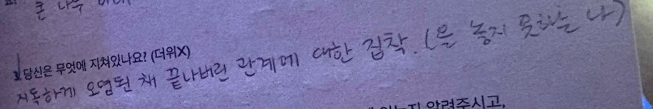 너무 감정적인 8월의 마지막 날. 브런치를 메모장 삼아 쓴 글이 보여준다. 말끔하지 못한 인간이라는 사실이 지겹다. 구질구질한 사람을 벗어나고 싶지만, 결국 태생이 이런 사람은 아무리 발버둥 쳐도 마지막엔 혼자 남게 된다. 차라리 가벼운 관계 속에서 여러 번 상처를 받는 편이 나을지도 모른다. 자존감이라는 잘 짜인 이고가 박살 나는 게 나을 법도 하다. 한 사람에게 마음을 열고, 그에게 너무 깊이 베인 상처가 극복되지 않고 몸과 마음에 이상반응으로 번지는 것. 도대체 이걸 뭐라 정의해야 할까.