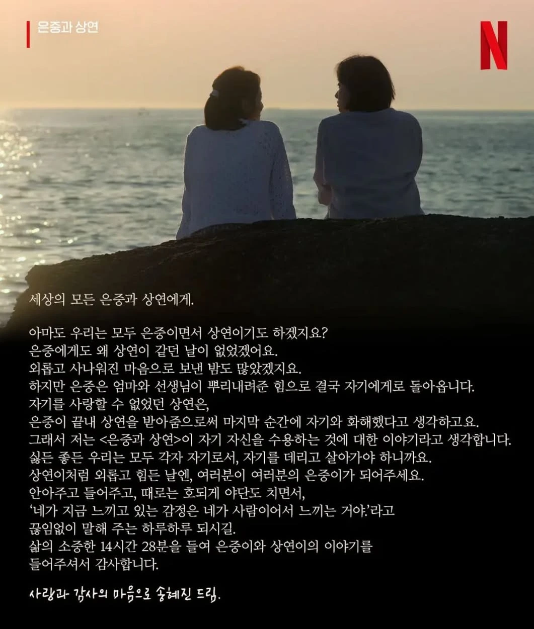 ‘폭싹 속았수다’ 이후 처음 끝까지 본 한국 시리즈였다. 결국 마지막에는 꾹꾹 눌러왔던 울음을 터뜨렸다. 다음 날 일정이 있어 붓는 게 싫었지만, 끝내 오열했다. 왜였을까. 아마도 나에게도 그런 친구가 있었기 때문일 것이다. 지독하게 좋아했지만 결국 비슷하게 끝난 친구. 완전히 같진 않지만, 나는 은중보다는 상연에 가까운 사람이다. 은중이 내뱉던 “누가 끝내 널 받아주겠니.”라는 말이 가슴을 찔렀다. 나는 그런 말을, 정말 사랑했던 사람들에게 직접 들어본 적이 있다. 그래서 그 대사는 지금도 쉽지 않다. 상연이 느꼈을 저주처럼. 나는 그 아이에게 상연처럼 이기적으로 굴었고, 결국 남자 문제로 멀어진 것도 비슷하다. 그래서 오랜만에 그 아이가 생각났다.