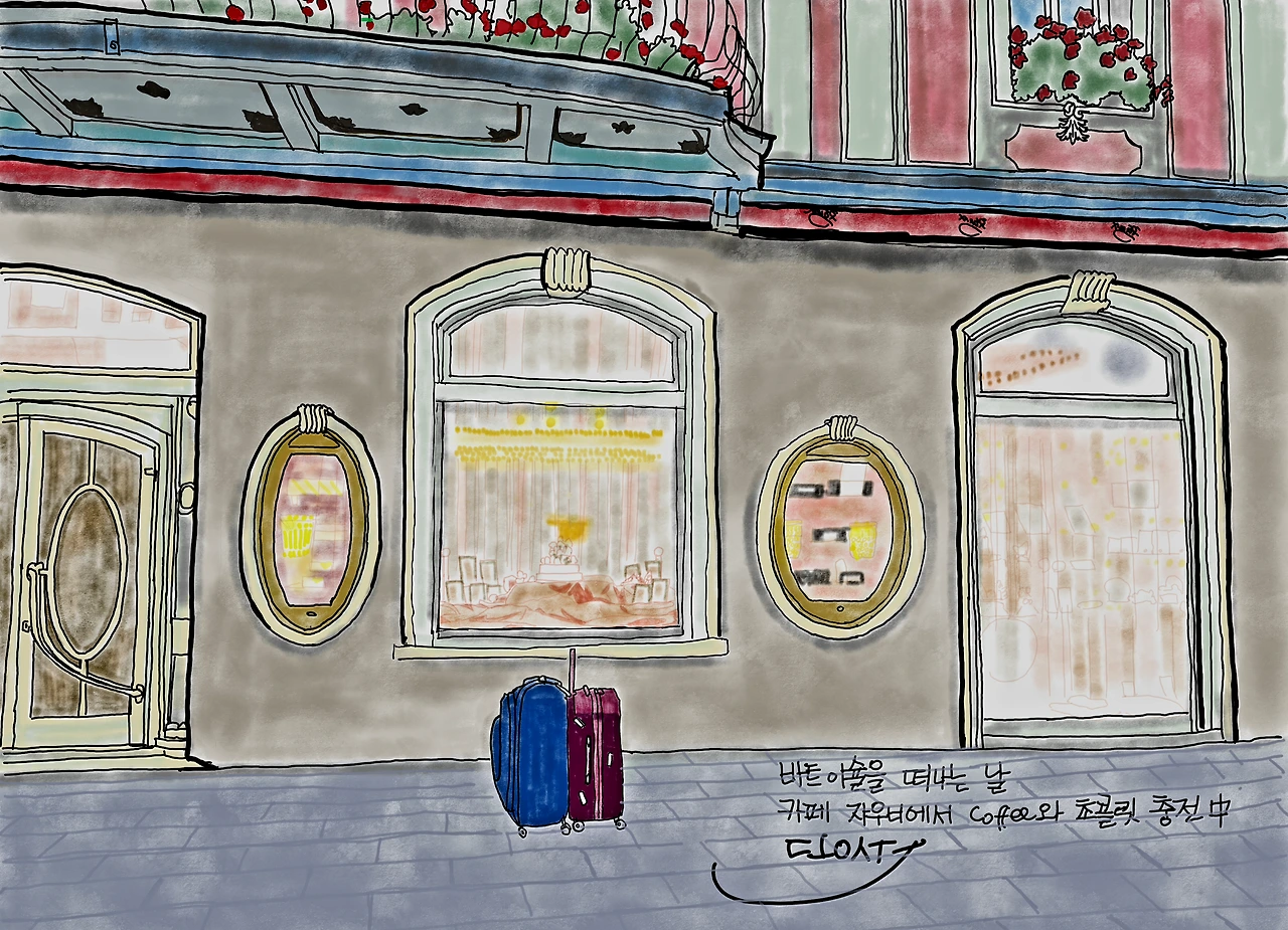콘디토레이 카페 자우너! 1832년부터 황실에 디저트를 납품했다는 카페가 이틀 머물렀던 아파트 맞은편에 있어 달달한 초콜릿케이크에 커피 한 잔이 간절했으나 워낙 대기줄이 길어 내내 불발이었다. 오늘 아침 바트 이슐을 떠나는 내 사정을 헤아렸는지 드디어 카페의 문턱을 넘어섰다. 씨씨가 머물렀단 숙소보다 여기가 황실이 아닐까 싶게 화려하면서도 엔틱 하다. 그리고 온몸을 휘어 감는 초콜릿 향기, 초콜릿 가격이 비싼 게 향기까지 값을 매긴 탓일지도.