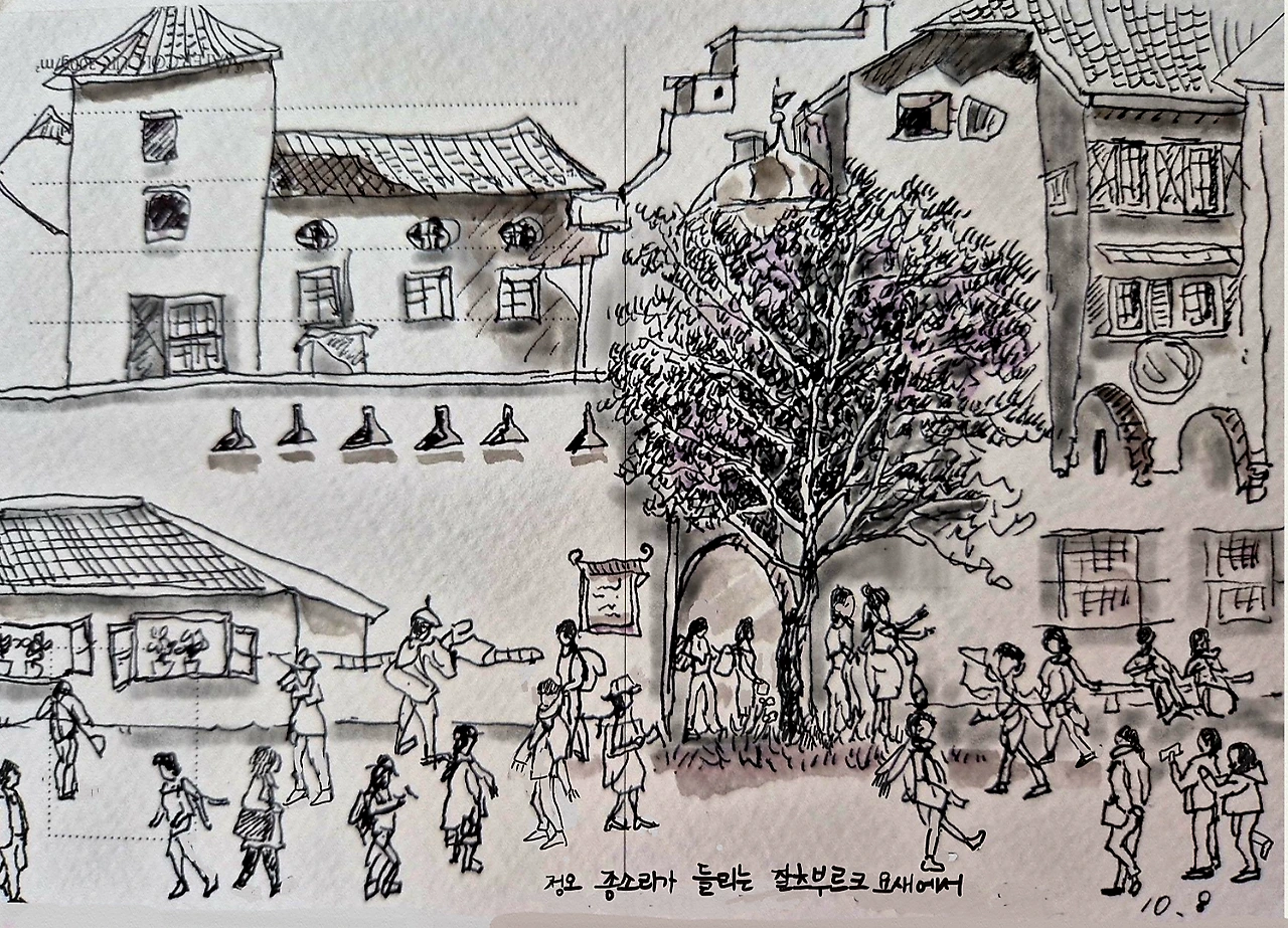 볼거리 많은 곳이라 눈 둘 데 많아 두리번거리다가 말똥을 밟을 뻔했다. 발아래 세상은 말똥들이 징검다리를 만들어 냄새나고 축축하고 지저분하다. 말똥 밟을 뻔해서야 알게 된 아름다움의 이면에 탄식하는 중인데 종소리가 울린다. 사람 사는 사는 세상이 어디 아름답기만 하겠냐고.