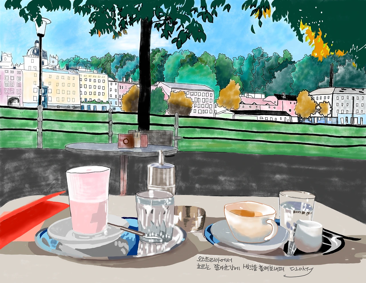 산책보다는 쉼 타임이니 자물쇠다리가 바라보이는 강가 카페에서 브런치를 즐겼다. 아주 오랫동안 강이 흐르는 굽이를 따라 마음을 흘러 보냈다.