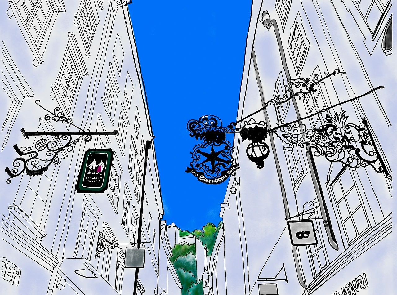해가 사정없이 째려보는 즈음에야 다시 산책돌입을 한다. 정말 우연히 쑥 들어섰는데 세상에서 가장 아름다운 거리, 게트라이데거리였다. 고풍스러운 건물마다 아름다운 수공작품으로 만든 이름표를 달고 있다. 가게의 특징을 표현한 독특한 수공간판은 모두 예술작품이다. 글씨를 모르는 사람들을 배려하기 위하여 만들었다는 의미가 더해지니 '세상에서 가장 아름다운'이란 수식이 저절로 따라붙을 수밖에. 맥도널드도 루이뷔통도 예술적 배려로 조화로운 이름표를 자랑한다.