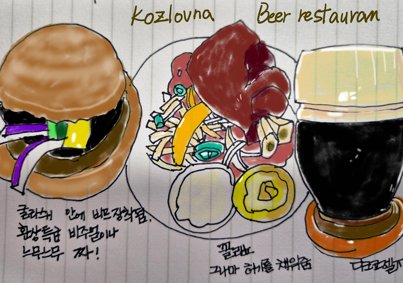 까를교 인근에서 찾은 맛있는 산책 지는 코젤맥주 직영 비어 레스토랑이다. 까를교를 꽉 채운 사람들의 물결이 이어져있다. 현지인 사이 한국의 청춘들도 참 많다.