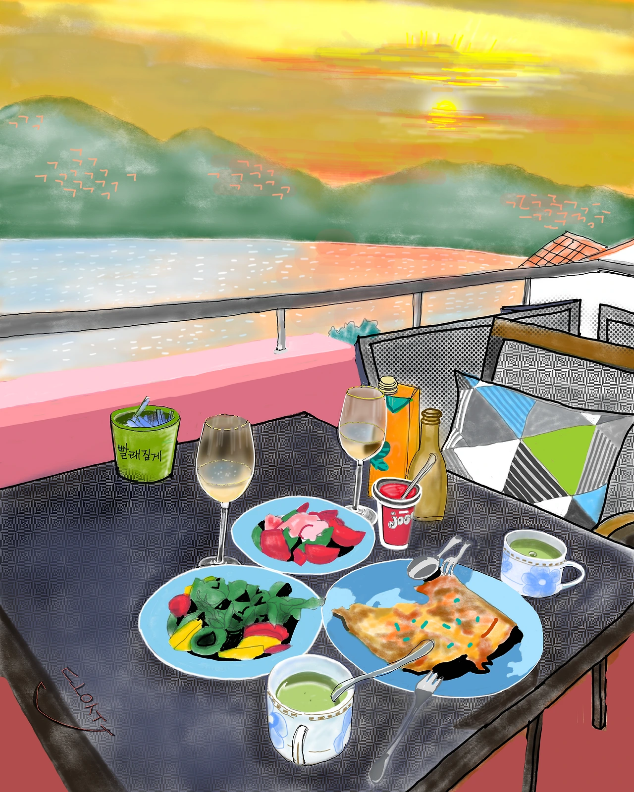 동유럽 여행을 하면서 딸과 정한 식당 찾기 철칙은 굳이 블로거 맛집을 찾지 않으며 필이 통하면 그냥 들어간다, 여서 산책 중 점심식사만 외식으로 아침과 저녁은 산꼭대기 플라워하우스에서 먹었다. 유럽요리는 대부분 소금레시피가 따로 있는 듯 지나치게 짜서 택한 선택이었으나 저녁엔 감정이 출렁이는 일몰운치만찬, 아침엔 상쾌 바람 셰프가 만들어주는 브런치가 펼쳐지는 플라워하우스는 어제 먹다 남은 피자도 대충 만든 스파게티도 미슐랭급 요리로 변신시키니 사실 우리 집이 최고였단 사실!