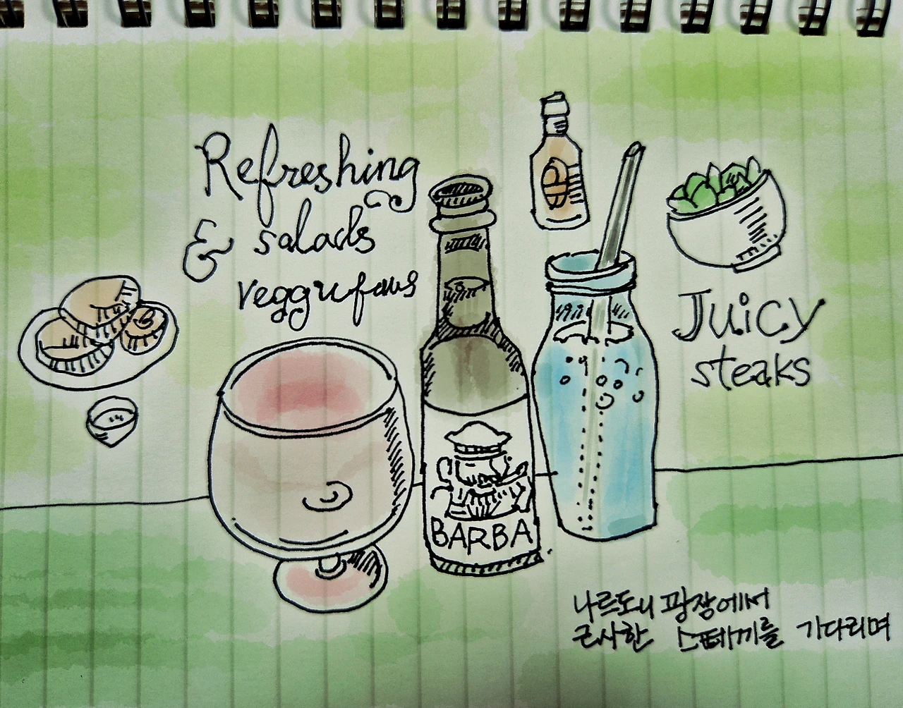 스플리트의 나르도니 광장에서 스떼끼를 기다리며 비어에 젖어드는 중 거리 벽면을 장식하고 있는 그림들이 눈에 잡힌다. 여든이 훨씬 넘은 듯한 할아버지 화가분의 색연필 그림을 그리며 그가 그린 그림을 팔고 있다. 검은색 연필로 세밀하게 크로아티아 사람들의 일상을 그리고 그 위에 무심한 듯 툭툭 채색을 입히며 그림에 열중하다가도 그림에 관심을 갖는 이가 다가가면 아주 정성스레 눈을 맞춘다. 우리가 밥 먹을 동안 아무도 그림을 사는 이 없으면 하나 사달라, 하늘이에게 부탁한 참인데 비어의 마지막 한 방울까지 홀짝이다 보니 두 점이나 팔렸다, 결국 그림은 사지 못하게 됐으나 그림 판매로 기분 좋아진 할아버지의 호탕한 웃음소리를 들을 수 있으니 이 또한 다행이지 뭐~