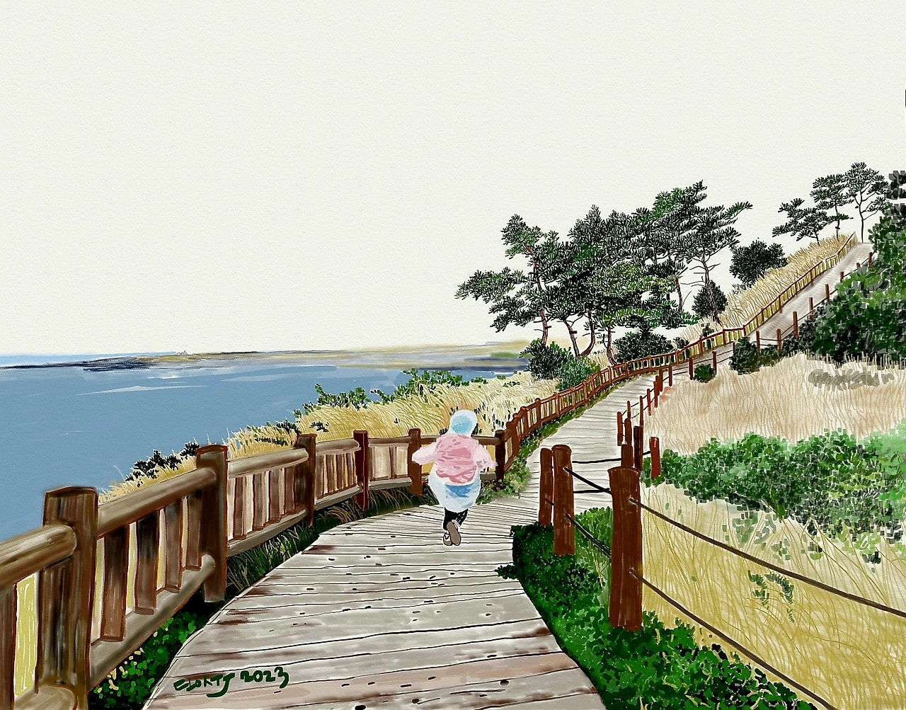 어디든 그림이고, 시가 떠다니는 송악산 둘레길에는 바람 앞에 저절로 겸손해져요. 머리를 숙이고 옷섶을 꽁꽁 여민 하준이는 그러거나 말거나 바람에 둥둥 떠다니다가 뜻밖의 횡재를 했어요. 바다에 윤슬이 춤추듯 뛰어다니네, 했는데 돌고래 무리의 댄스였던 거죠. 신산리에선 6월에나 볼 수 있다 하여 하준이의 낙심이 컸는데 3월 사계리 바닷가에서 만나다니 바람에도 잡히지 않는 하준이를 붙잡으려는 송악산할아버지 뜻인가 그랬어요.