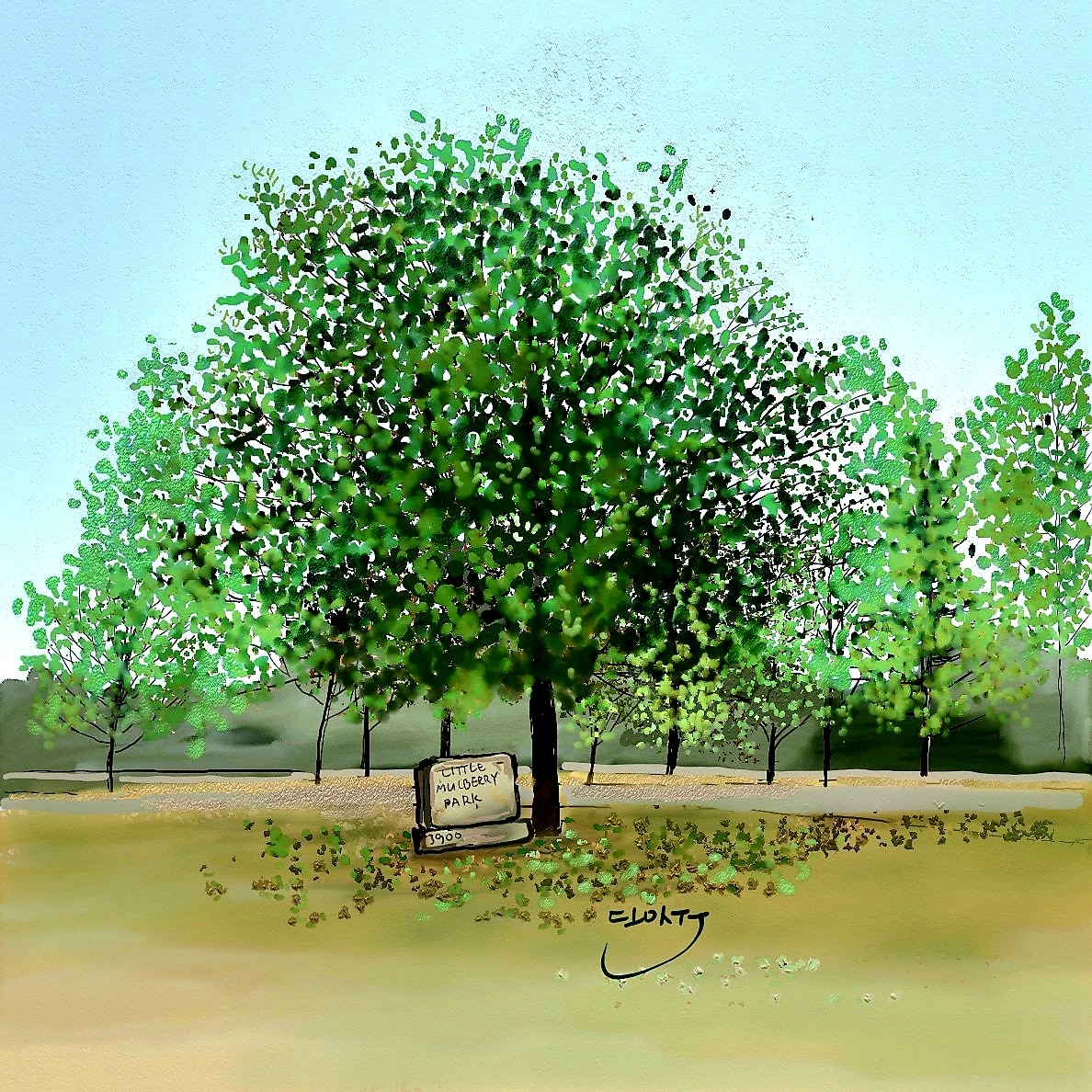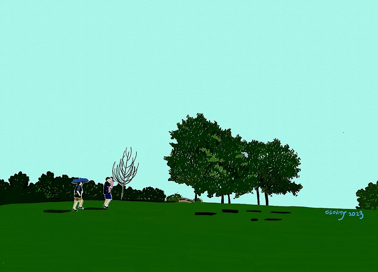 리틀멀베리파크는 어디든 곡선으로 이루어져 있어요. 까딱까딱 움직이는 그네가 반기는 언덕길의 둥근 눈웃음, 깊이와 크기를 가늠할 수 없는 둥그란 호수, 여기저기 제멋대로 늘어서 햇빛샤워 즐기던 달걀형의 초록나무들, 내 뒤를 따라오던 그림자마저 동글동글해요. 뜨거운 햇볕 가리는 내 우산도 눈웃음 흘리는 반달이군요.