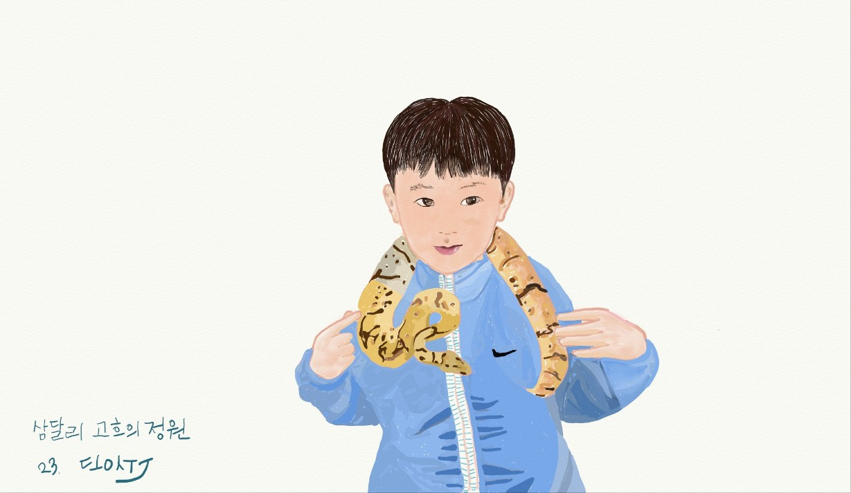 행운밥상을 받고 나서자마자 소동이 벌어졌어요. 식당 밖 줄지어선 항아리 사이에서 뚱뚱한 얼룩고양이 한 마리가 하준이를 향해 안녕? 인사를 했고 하준이가 대답하기 전에 사라져 버린 거예요. 얼룩고양이를 다시 만나려고 옆집 매화나무 아래, 뒷마당 된장콩 끓이는 부뚜막까지 뒤졌는 데도 결국 나타나지 않는 얼룩고양이 때문에 애타는 하준이를 위해 할미가 밤새 고양이를 그려야 했다는 거지요. 고흐의 정원에서 신산리로 돌아오는 길, 집집마다 노랑노랑 귤나무 하나씩 품은 제주 삼달리에서 얼룩고양이 한 마리 품은 하준이 데이입니다.