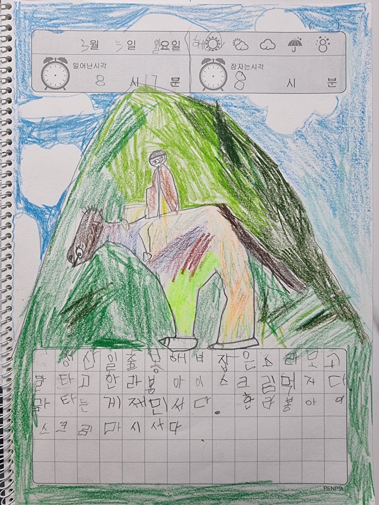 투어를 마치고 신산리로 돌아와 저녁준비하는 동안 대부분은 2차 체육시간이 진행돼요. 그림일기 쓰고 난 뒤엔 종이접기를 하거나 무서운 곤충그림책을 할미한테 읽어주거나 트롯 방송에서 영웅이형 찾아내 음악감상하다 잠들면 하루일과 마침 소등을 해요.