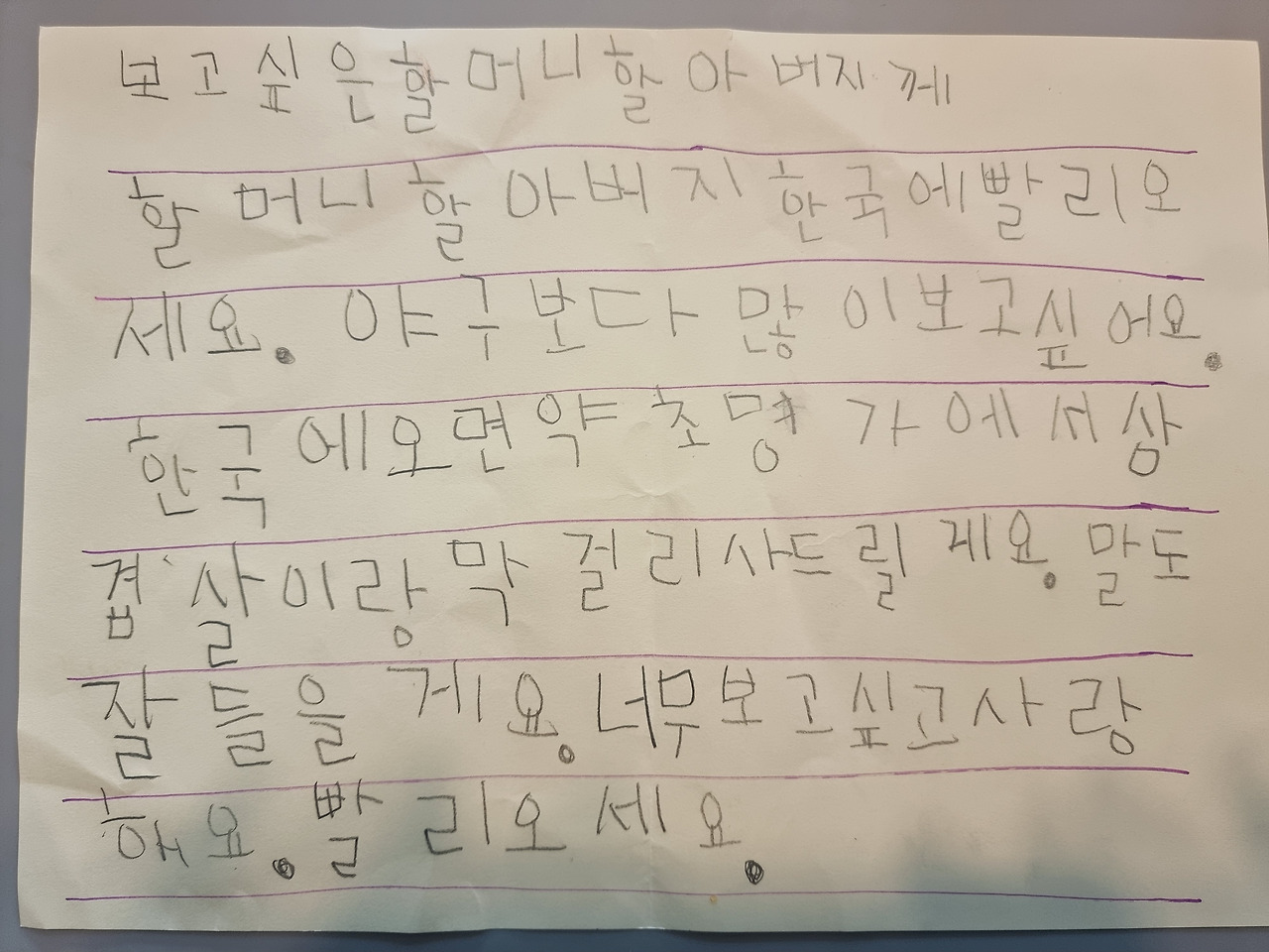 세 달이란 시간이 얼마나 긴 지 하준인 달력을 보며 날마다 한숨을 쉬고, 할미집에 갔다가 할미 없는 빈방에서 한참 울었다는 얘기를 듣고 할미도 애틀랜타에서 한참 울었대요.