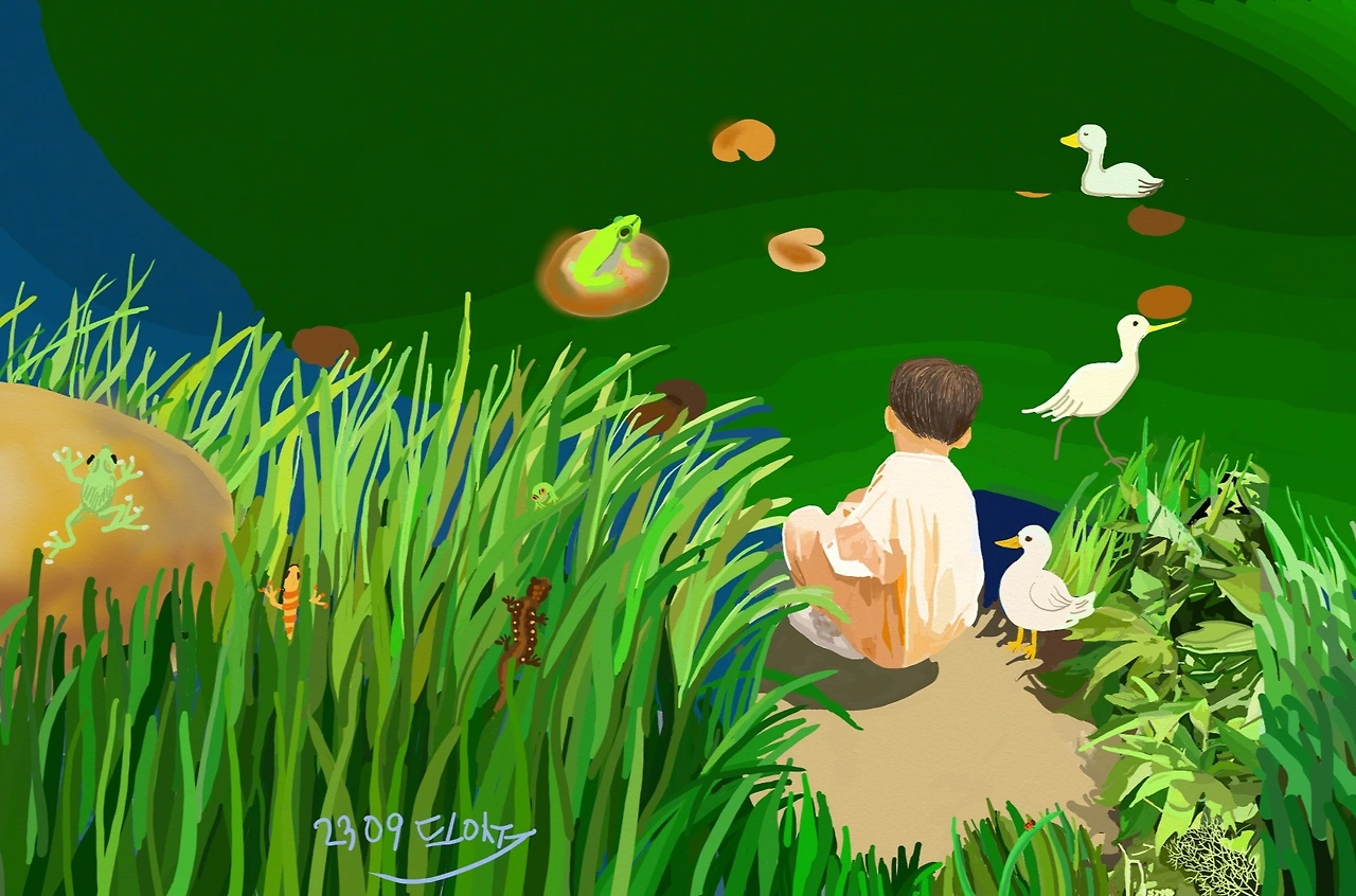 봄과 가을에만 개방되는 수목원은 하준이와 할머니가 자주 오래 함께 걷던 산책길이었어요. 봄에 젤리같이 투명한 도롱뇽 알을 만난 이후 내내 어떻게 변했을까 궁금해하던 참에 할머니 없는 가을날, 수목원 산책길에 찾은 연못에 도롱뇽 흔적은 아무 데도 없었어요.