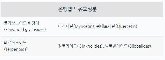 다양한 플라보노이드 배당체(Flavonoid glycosides)와 테르페노이드(Terpenoids)로 구성되어 있으며, 유효성분은 아래와 같다.