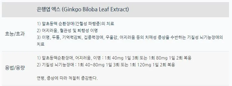 은행엽은 은행나무 잎을 분쇄 후 추출한 것으로 정제, 농축, 여과하여 제조한다. 폐경기 증상, 기억력 감퇴, 우울증, 두통 등 여러 경우에 사용된다.