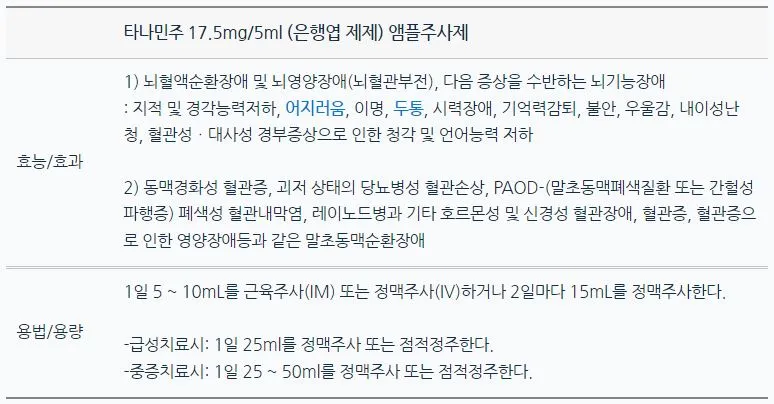 은행엽 주사제는 식약처 허가사항에 뇌혈액순환장애 항목에 두통과 어지럼증이 언급되어 있다.
