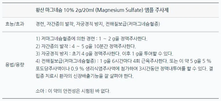 두통 시 마그네슘 주사제의 사용은 식약처 허가사항에 언급되어 있지 않으나, 두통 완화 목적으로 많이 사용되고 있다.