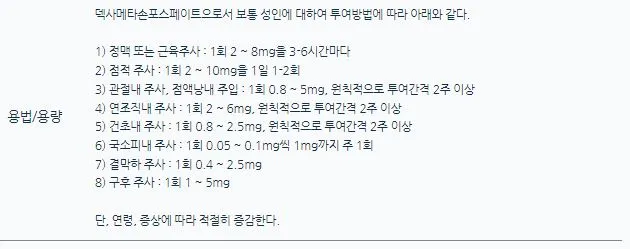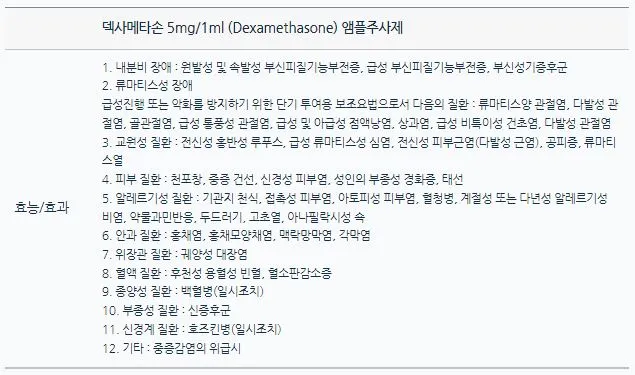 아래 표를 보면 덱사메타손이 참 여러 경우에 사용됨을 알 수 있다. 수많은 적응증을 보면, 왜 스테로이드제제가 만병통치약처럼 느껴지는지 쉽게 이해가 된다.