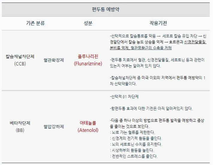 이 중 편두통 예방 목적으로 쓰인 약은 플루나리진(Flunarizne)과 아테놀롤(Atenolol) 두 가지이다.