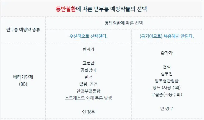 편두통 예방약물을 선택 시, 환자의기저질환을 고려하여 편두통과 기저질환을 같이 치료할 수 있는 약물을 우선적으로 선택하고, 기저질환을 악화시키는 약물은 피한다.