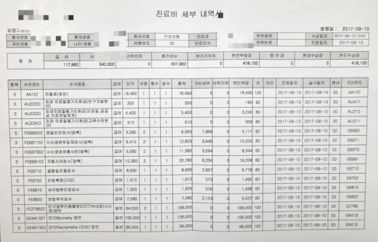 거금 40만 원. 녹내장 검사비용은 비쌌다. 그래도 마음의 안식을 위해 지불한 비용이라 생각하면 쓰린 속이 조금 달래 졌다.