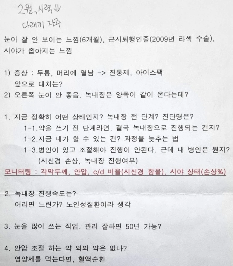당시 난 매우 진지해서, 대학병원 진료에 앞서 물어볼 내용을 한껏 준비했었다. (뭔가 생각이 많았던 건 알겠는데, 지금 읽어보면 잘 해석이 안된다) 그러나 잔뜩 준비해 간 질문은 아무 소용 없어졌다. 모든 질문이 내가 녹내장이라는 전제 하에 작성된 것이었기 때문에 물어볼 필요가 없어진 것이다. 그야말로 헛수고였다.