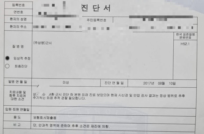 위 진단서가 보이는가. 질병분류기호 H52.1 내 주상병은 근시였다. 더는 안과를 찾지 않기에 충분했다.