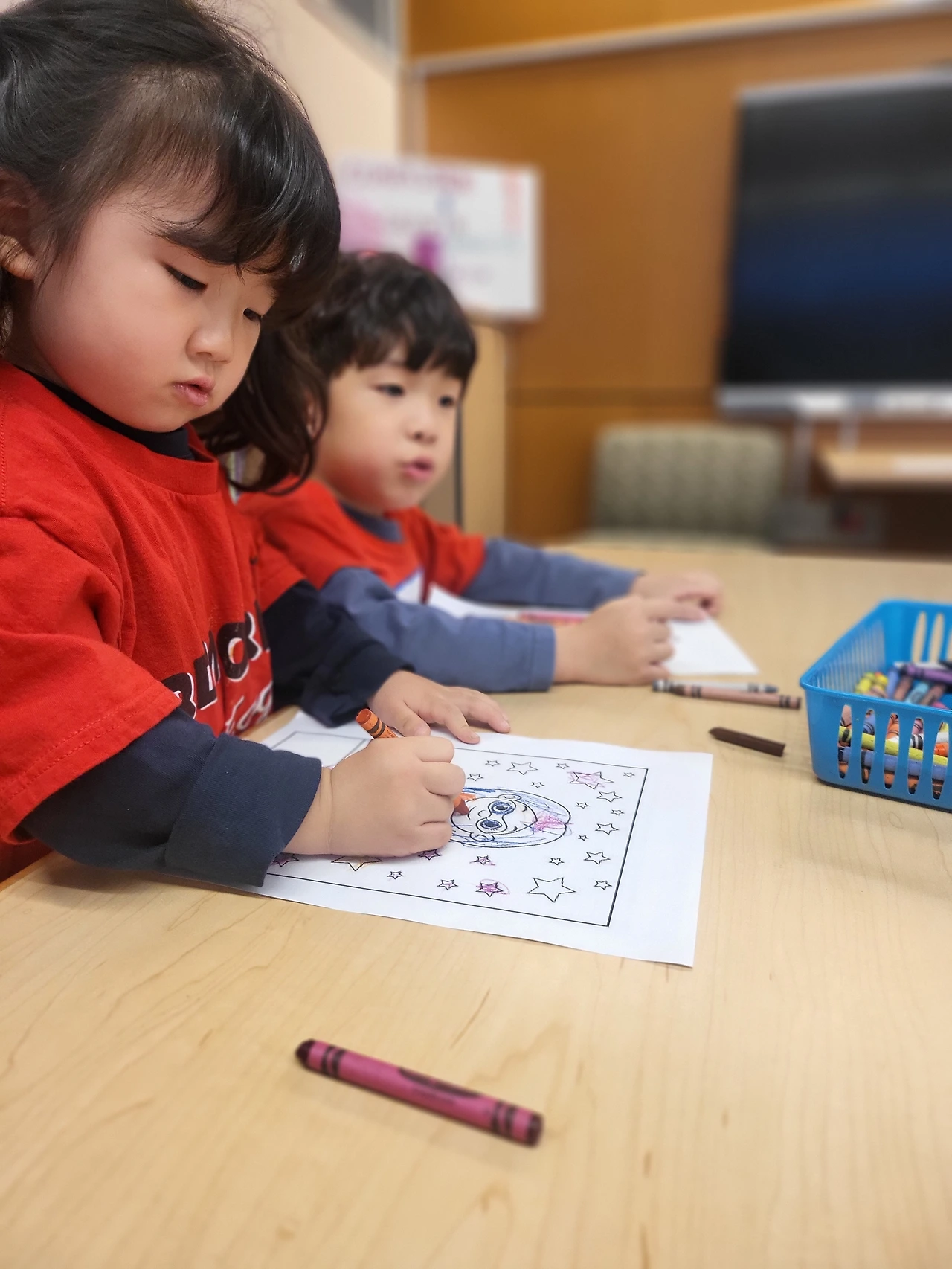 도서관에 들어가니 색칠 공부 종이와 크레용을 준다. 미국에서는 대부분의 식당에서 부모와 동반하는 아이들에게 색칠공부와 크레용을 준다. 보통 4색이나 5색인데 음식이 나오는 동안 조용히 하도록 주는 듯하다.