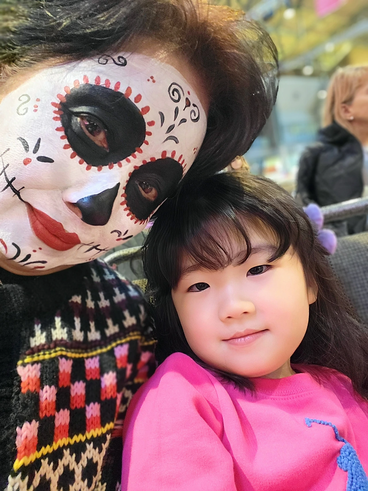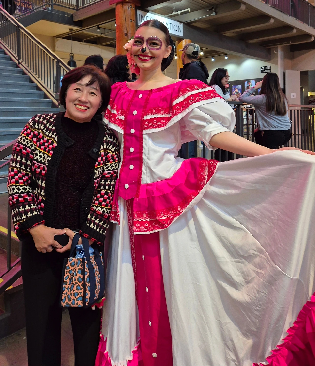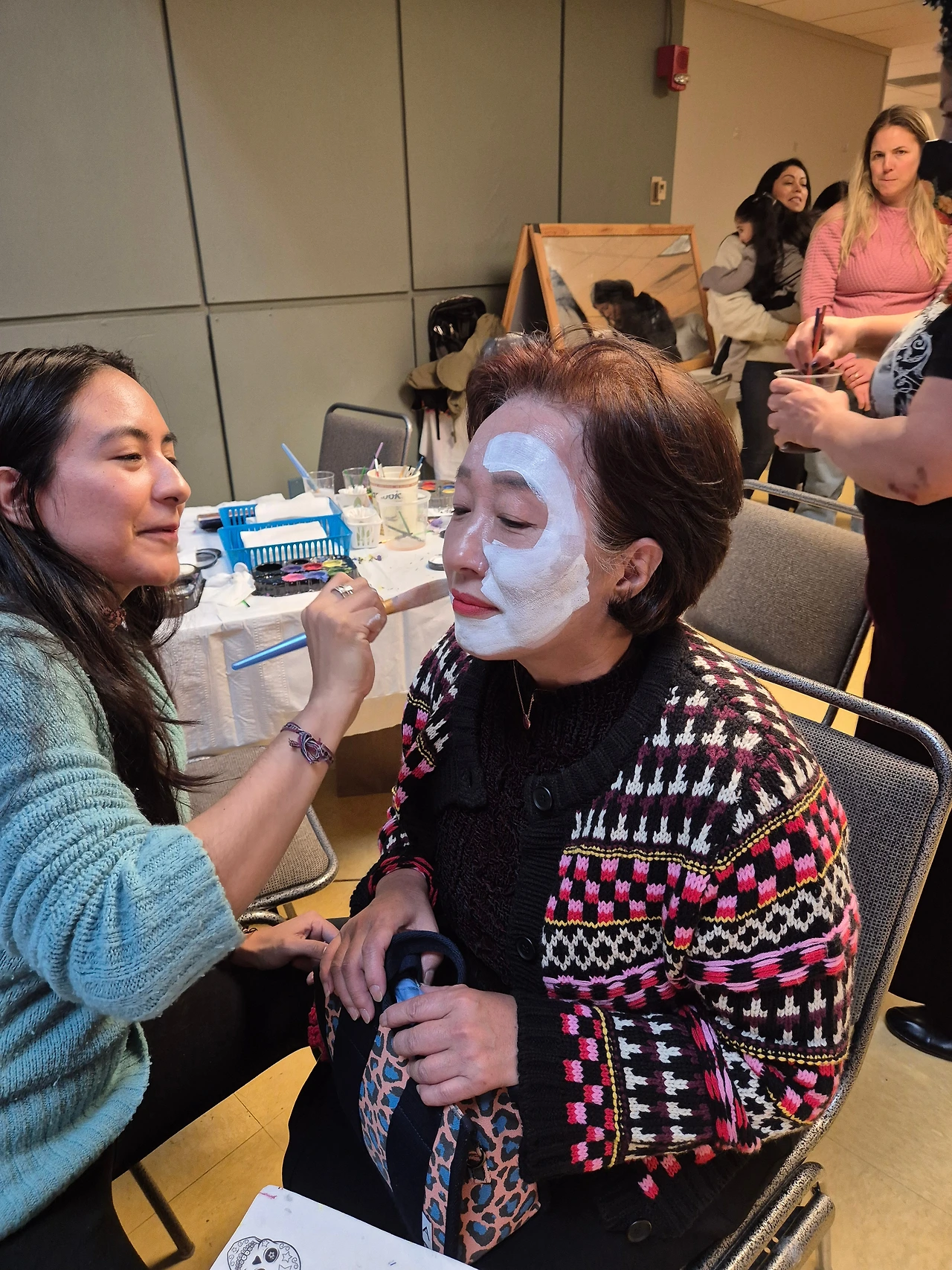 스카프를 사고 돌아보니 아이들이고 어른들이고 해골분장을 하고 돌아다니는 게 보인다. 행사를 진행하는 스테프나 연기자들 뿐만 아니라 관객들도 페이스페인팅을 할 수 있는 모양이었다. 궁금해하니 2층에서 무료로 페이스페인팅을 받을 수 있다고 알려준다. 이런 좋은 기회가 또 있을까 싶어 늘어선 사람들 뒤로 줄을 섰다. 한국 놀이공원 등에서 아이들에게 해주는 간단한 페인팅이 아니고 진짜 멕시칸들이 하는 것과 같은 완벽한 ‘카트리나’(죽은 자의 날을 상징하는 해골여성)로의 변신을 기대하며 눈을 감았다.